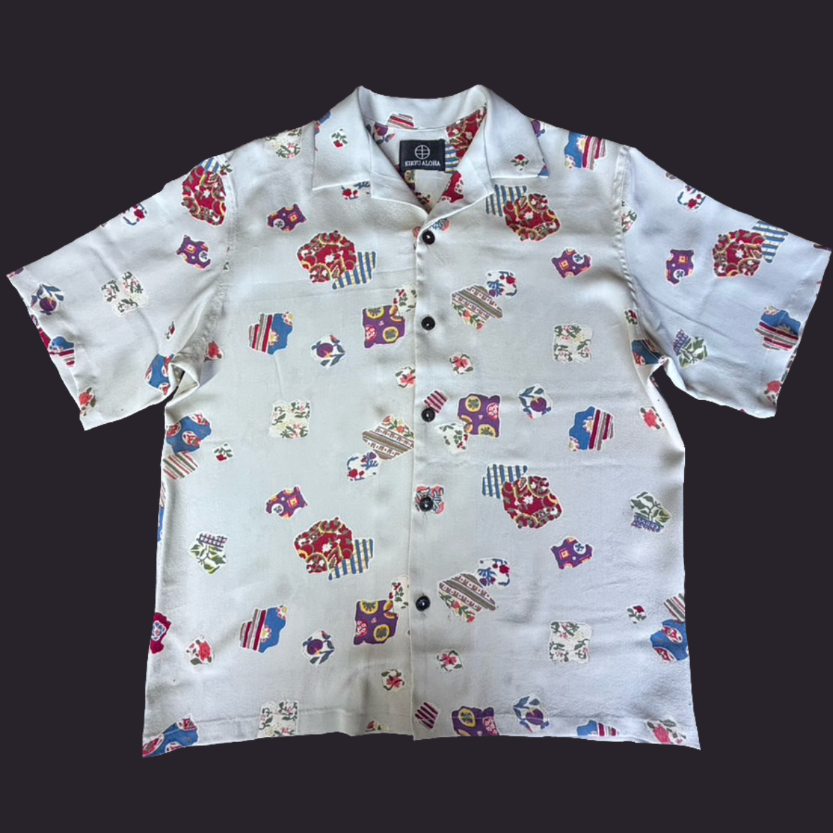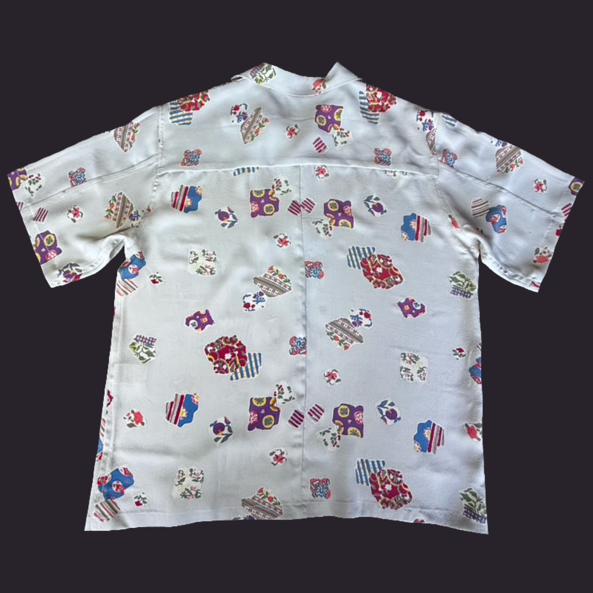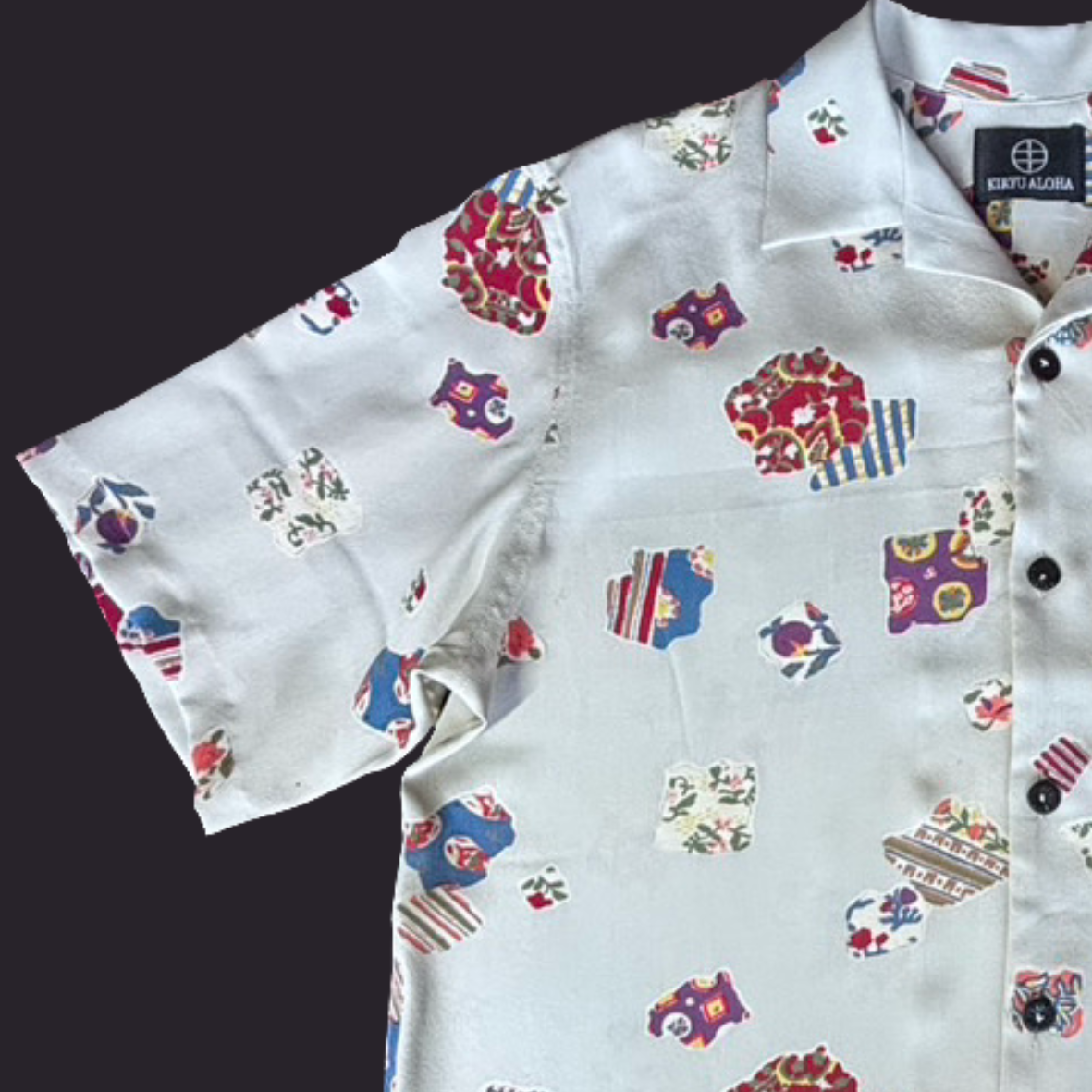 様々な柄の断片を切り取った裂取文様を配置した小紋をアロハシャツに。