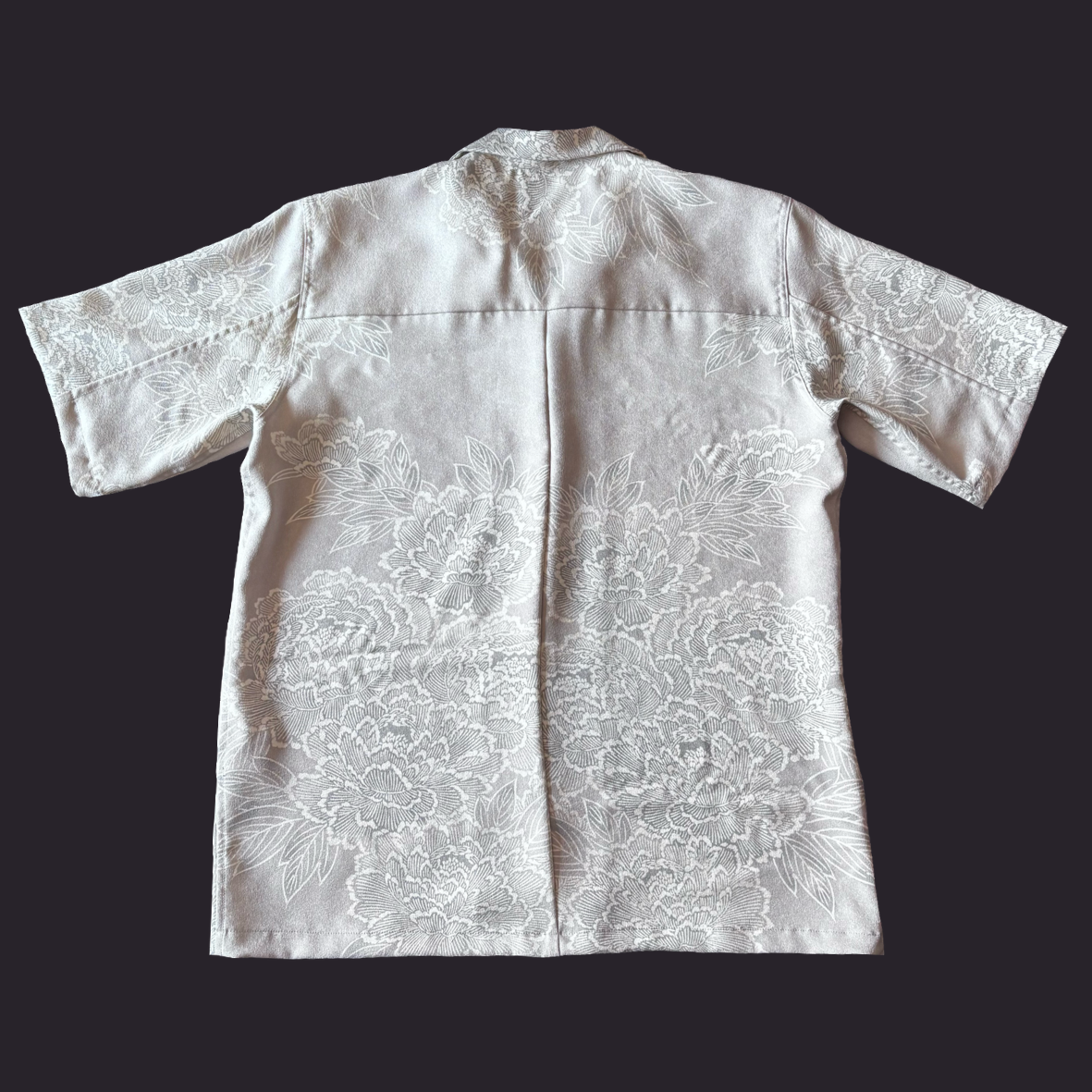 満開の牡丹を全体に染めた小紋をアロハシャツに。
