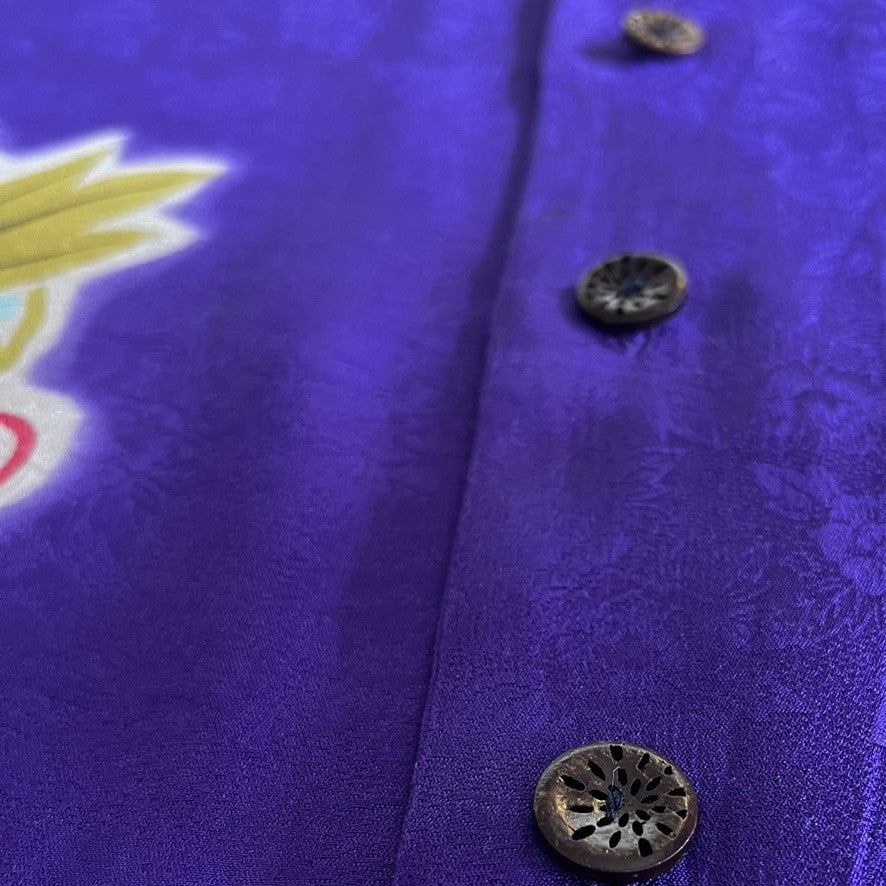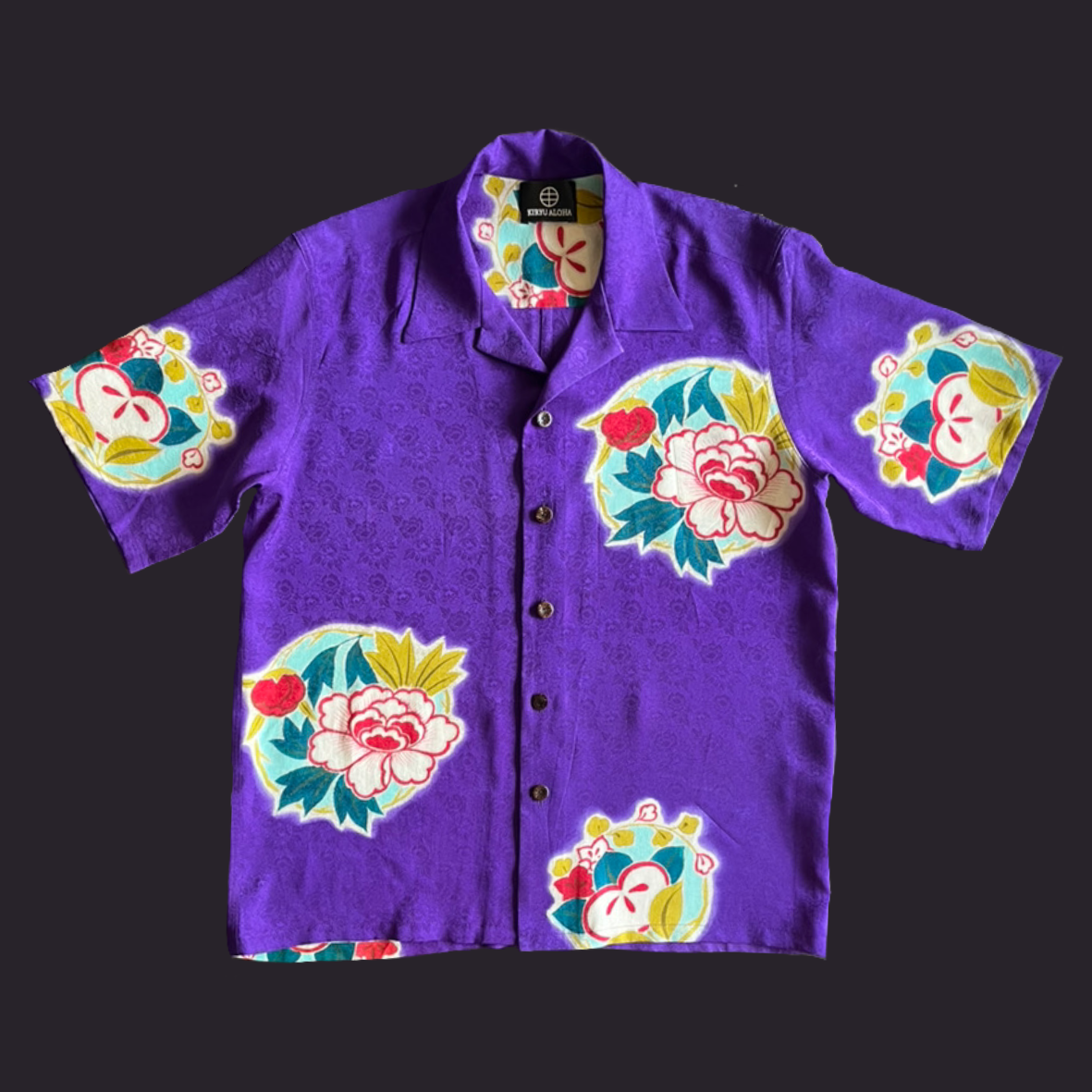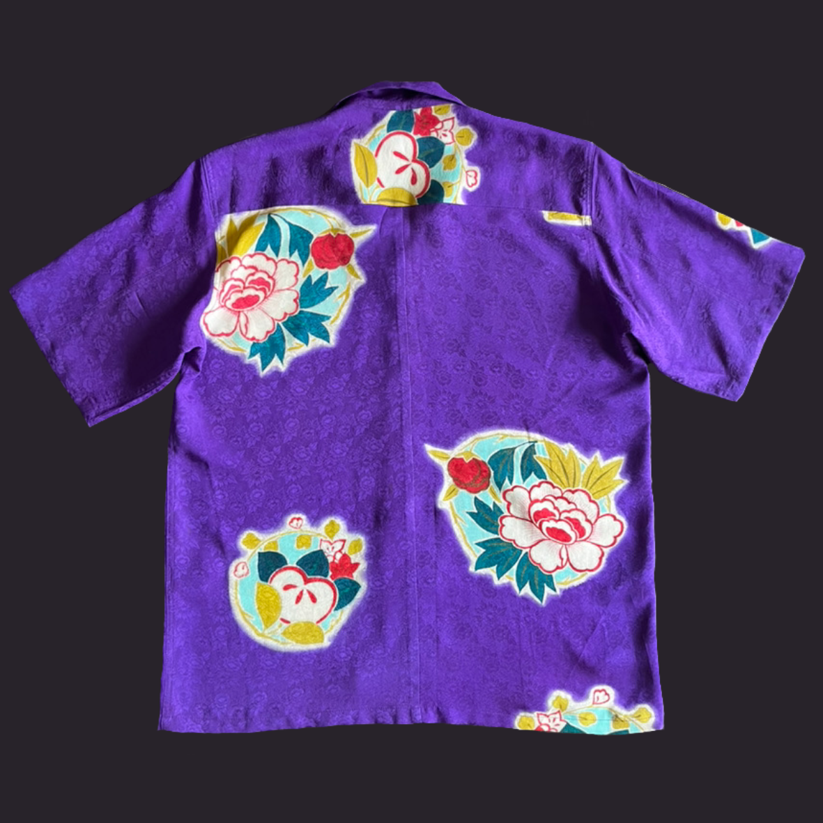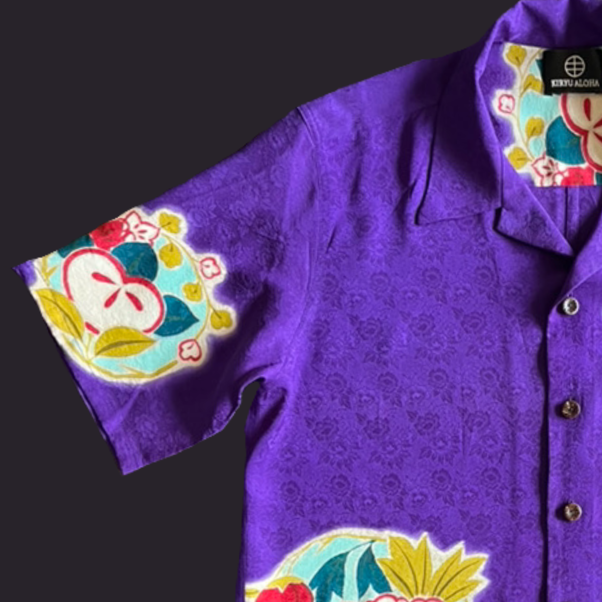手描き友禅で丸文に橘を描いた小紋をアロハシャツに。