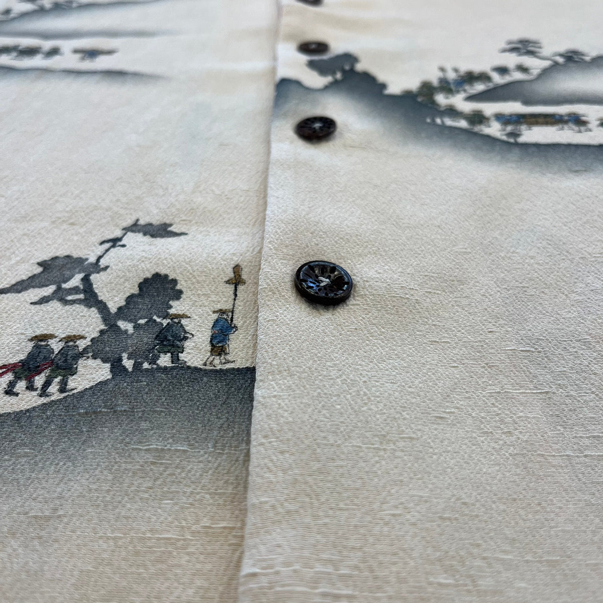 江戸時代の大名行列のようすを紬地に染めた小紋から。