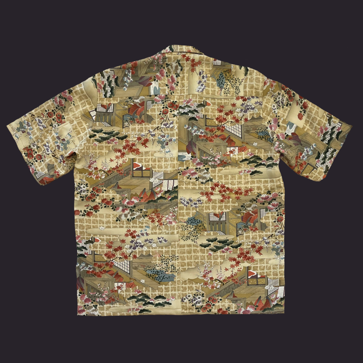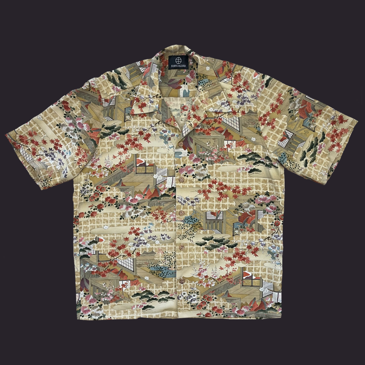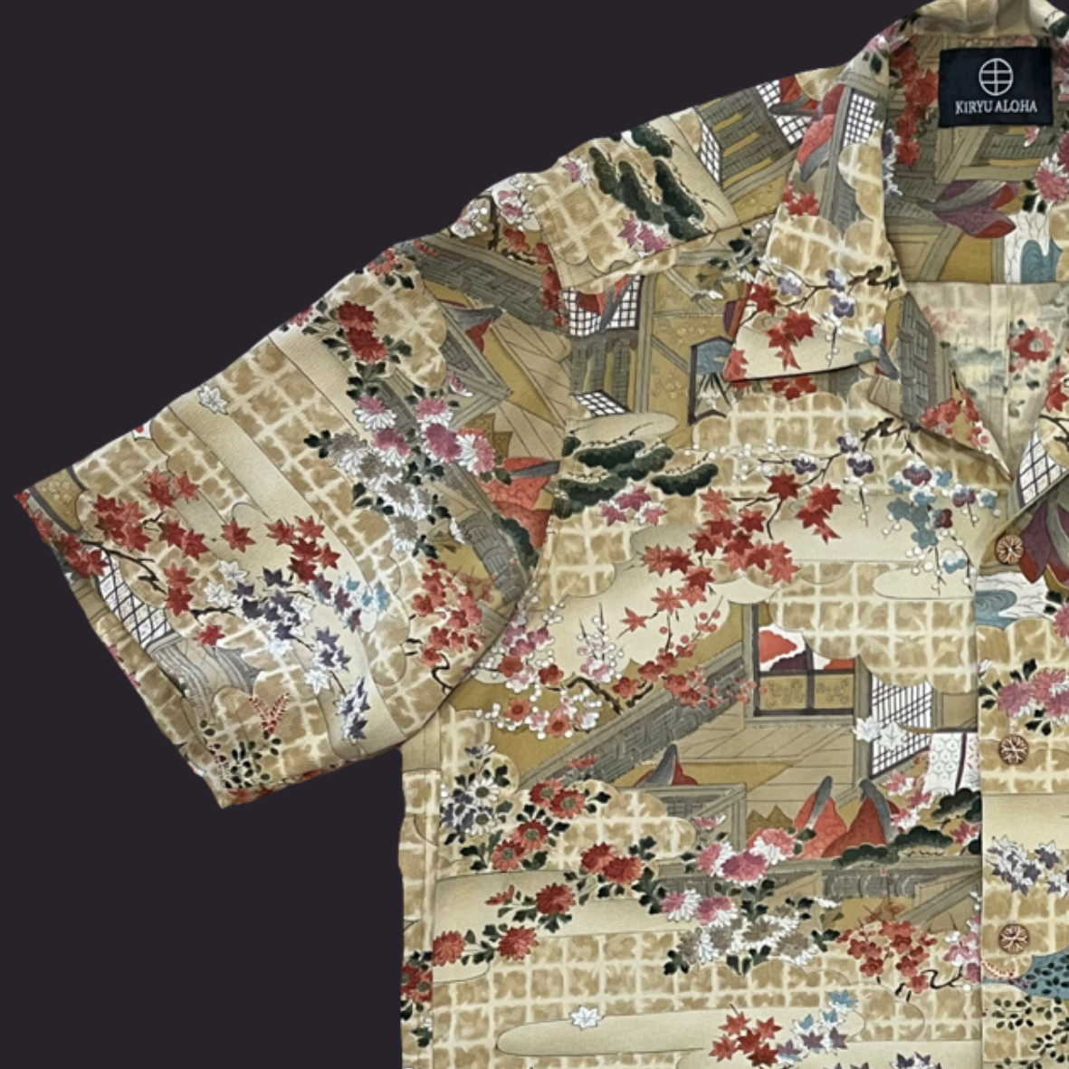 型染で御殿のようすを中心とした御所解文様を表現した小紋から。