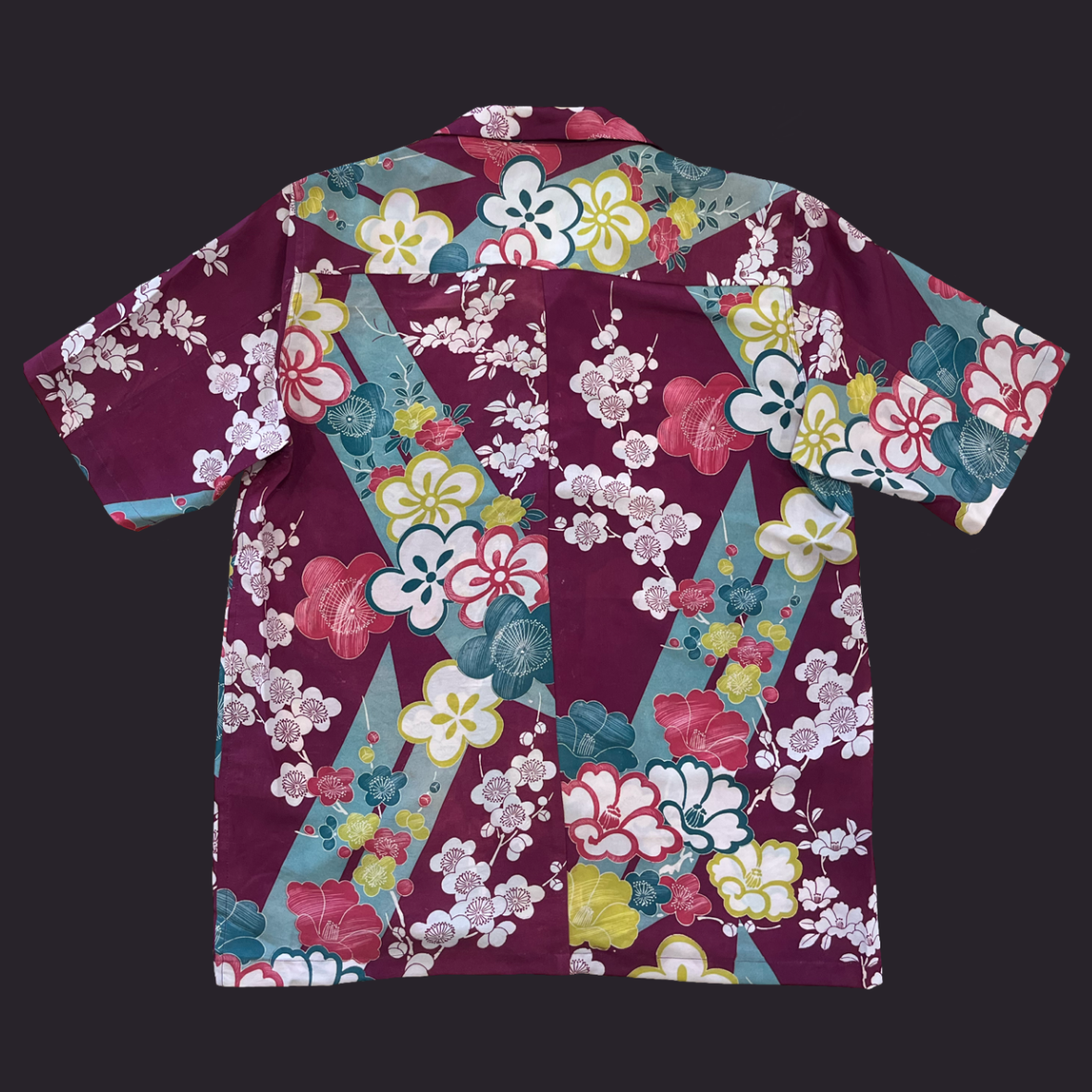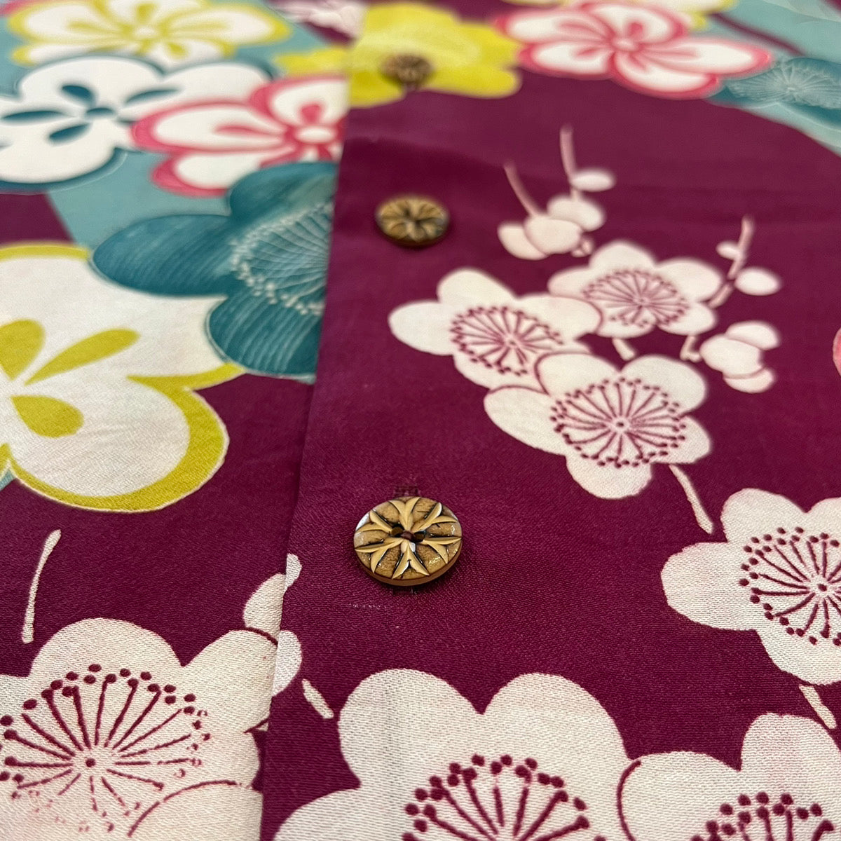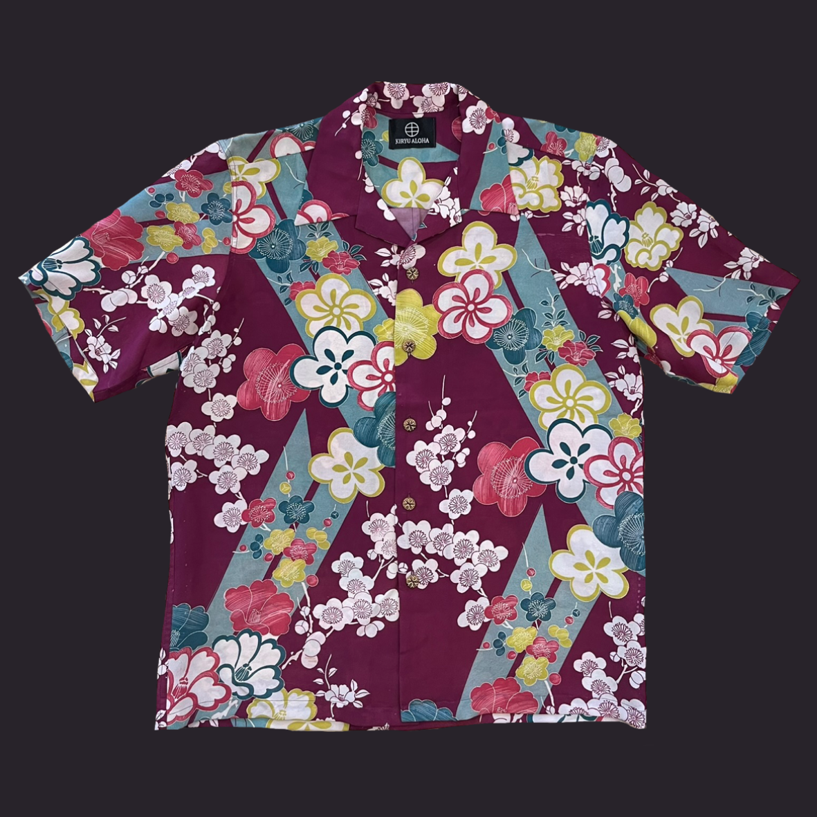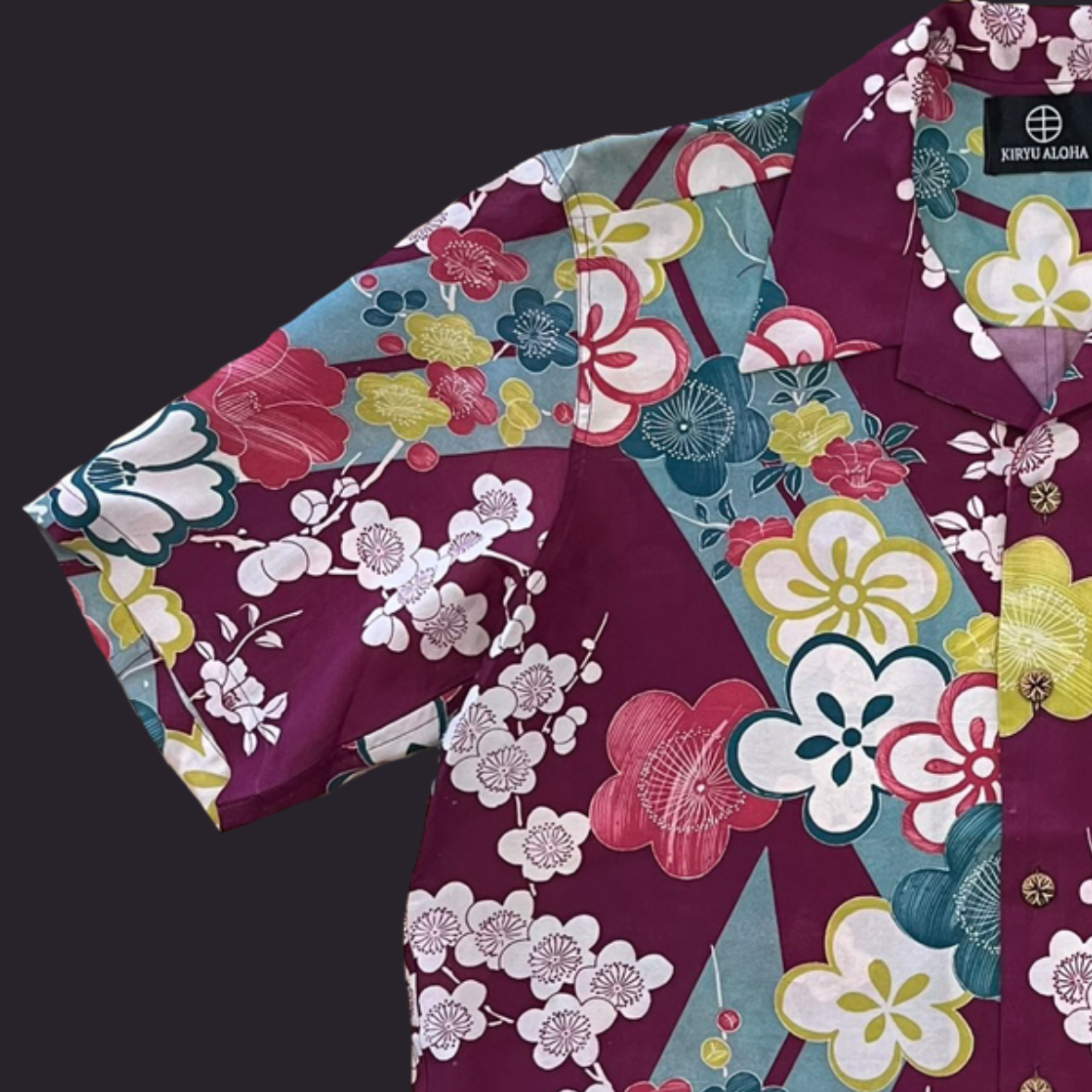 型染で様々な梅文様を染めた小紋をアロハシャツに。