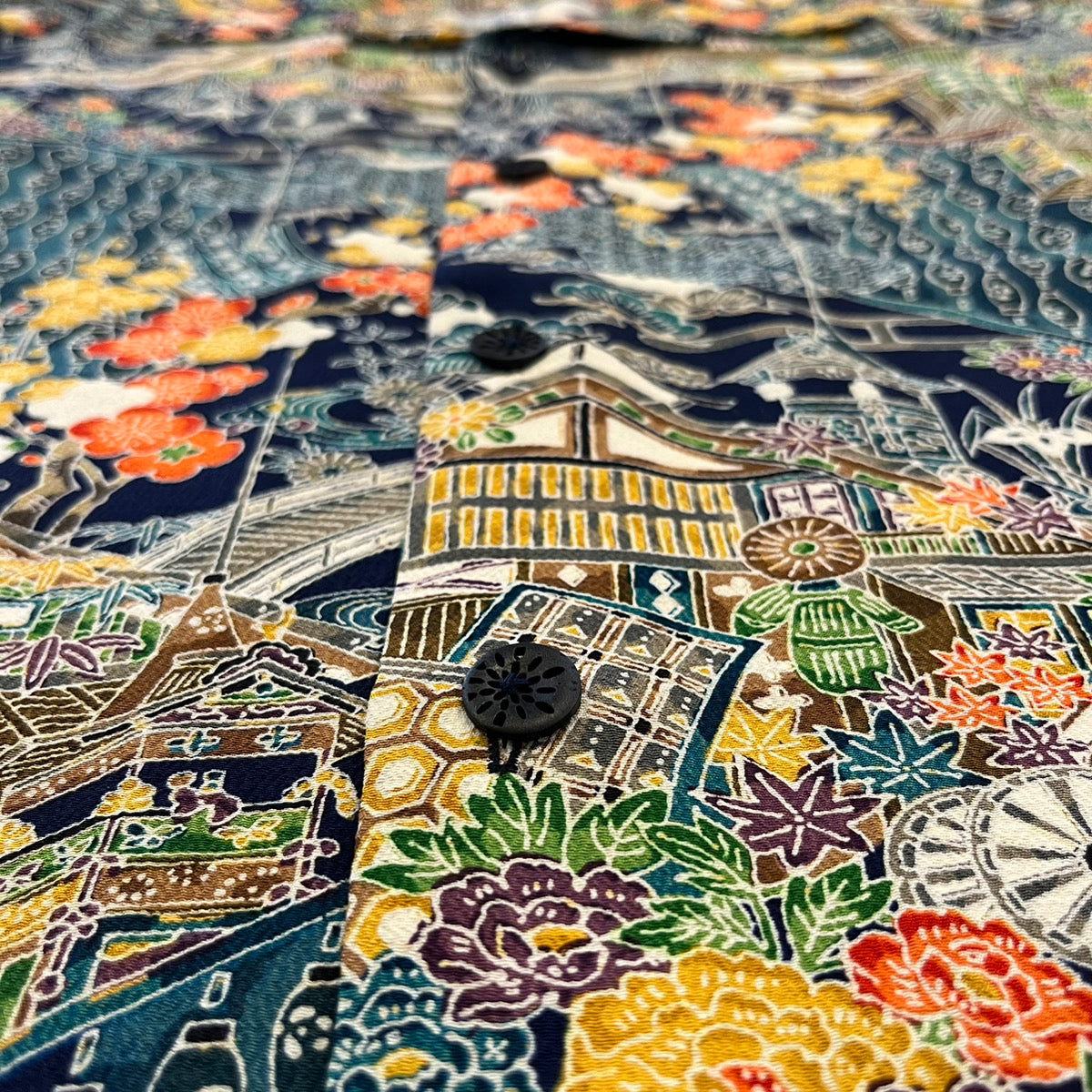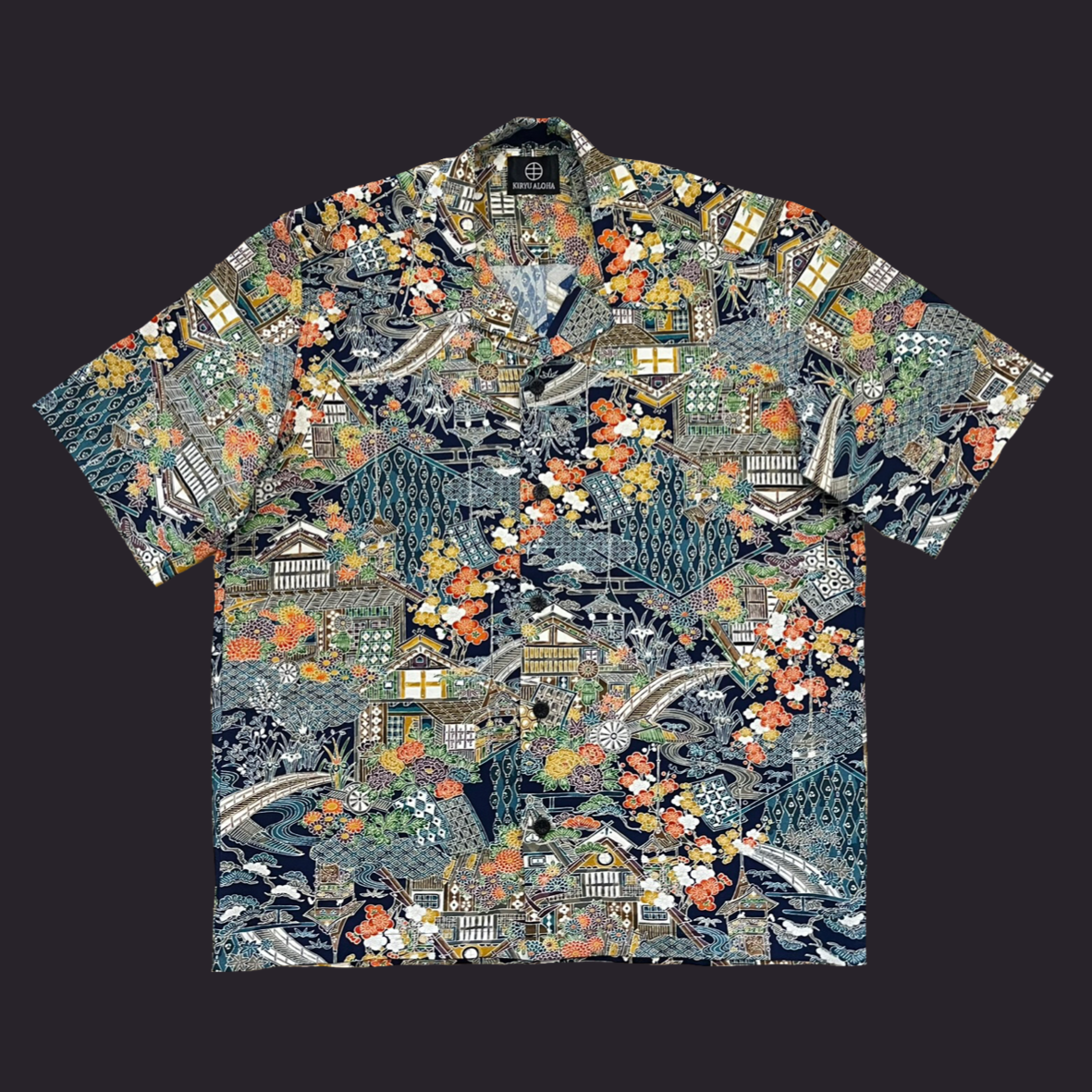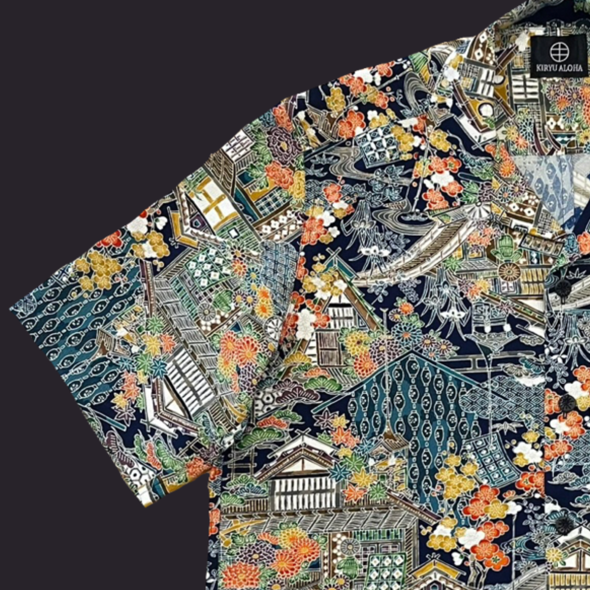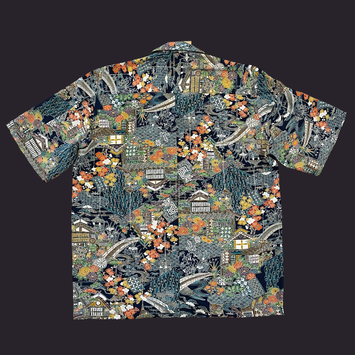 型染で全体に茶屋辻文様を表現した小紋をアロハシャツに。