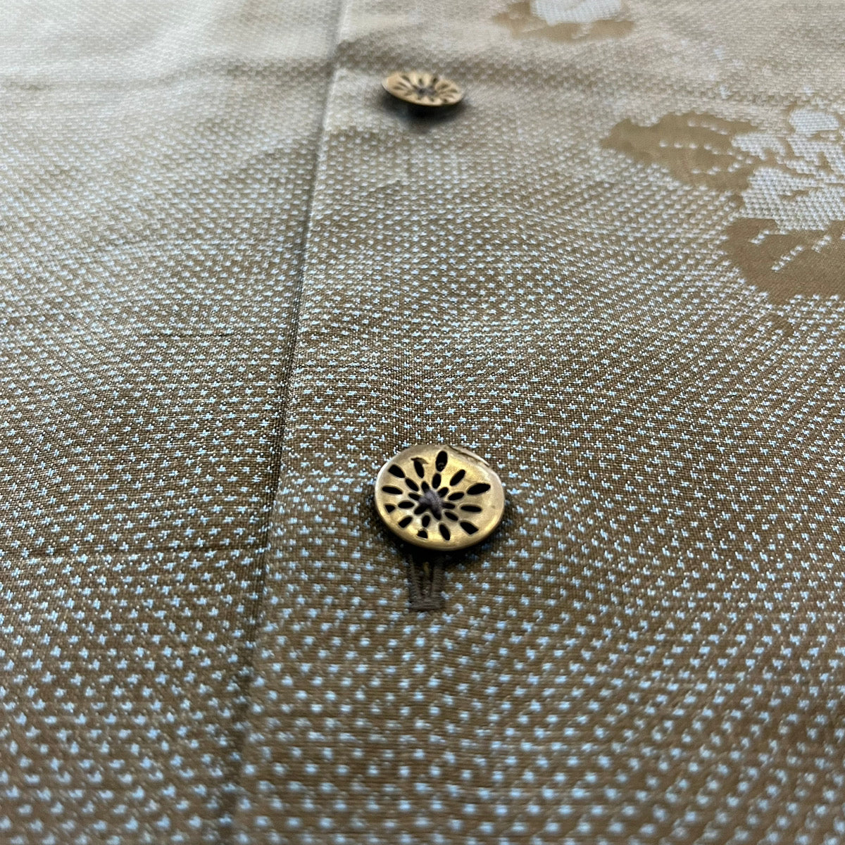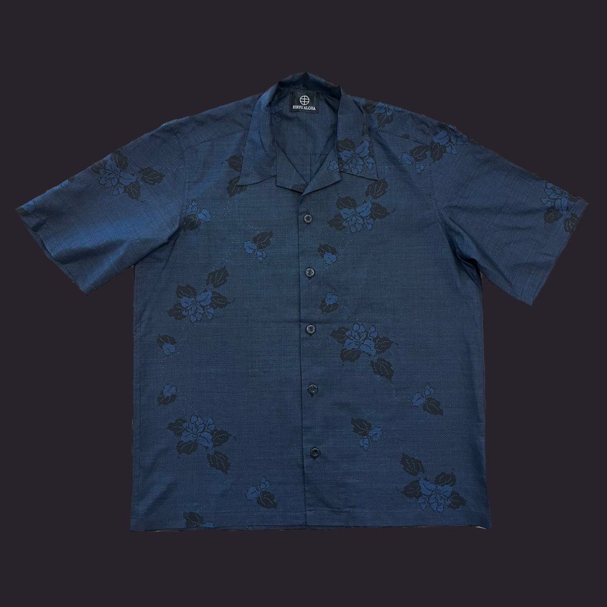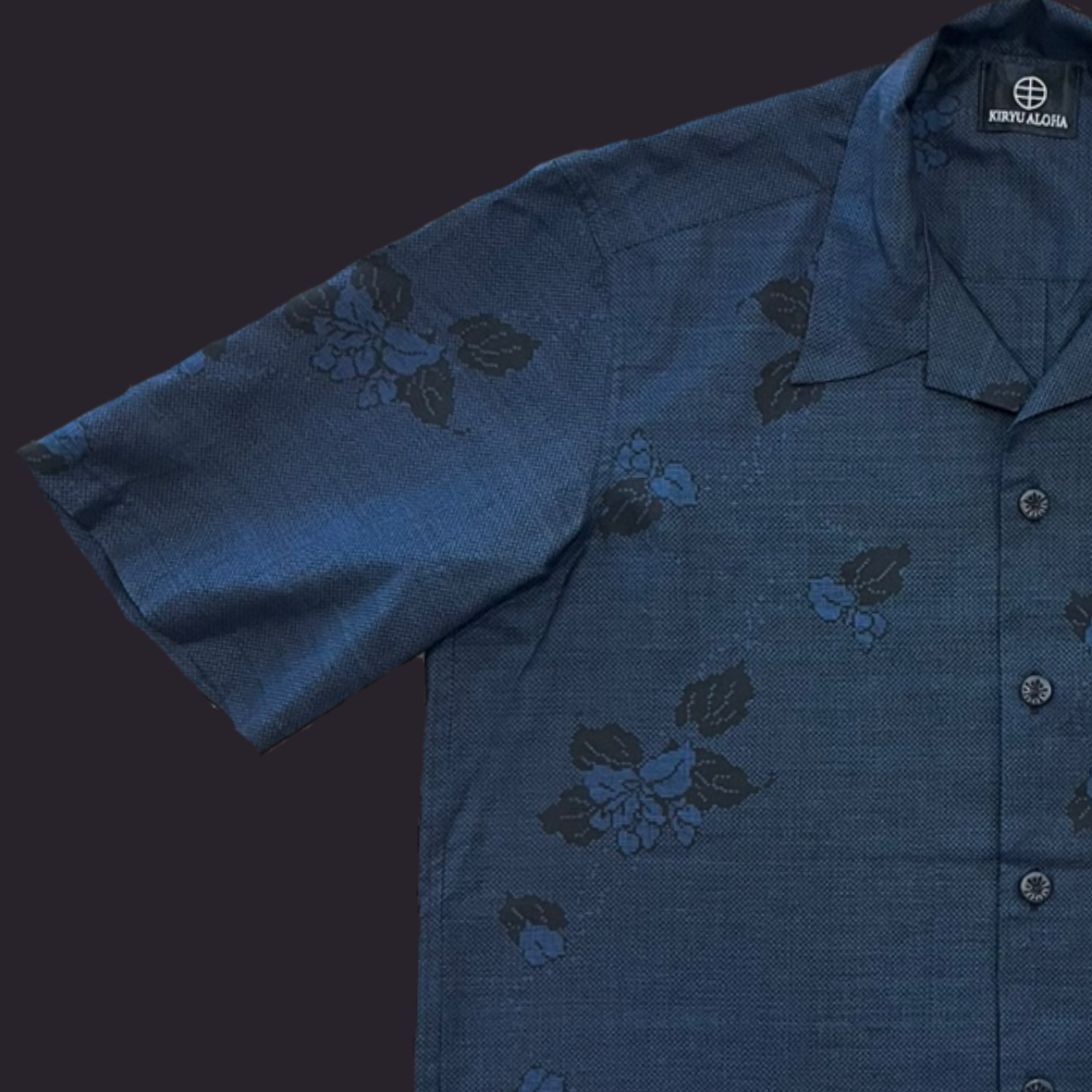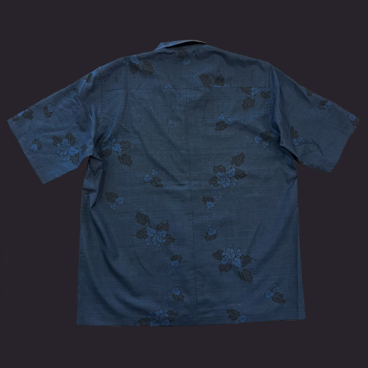 牡丹文様を流れるように織り出した大島紬をアロハシャツに。