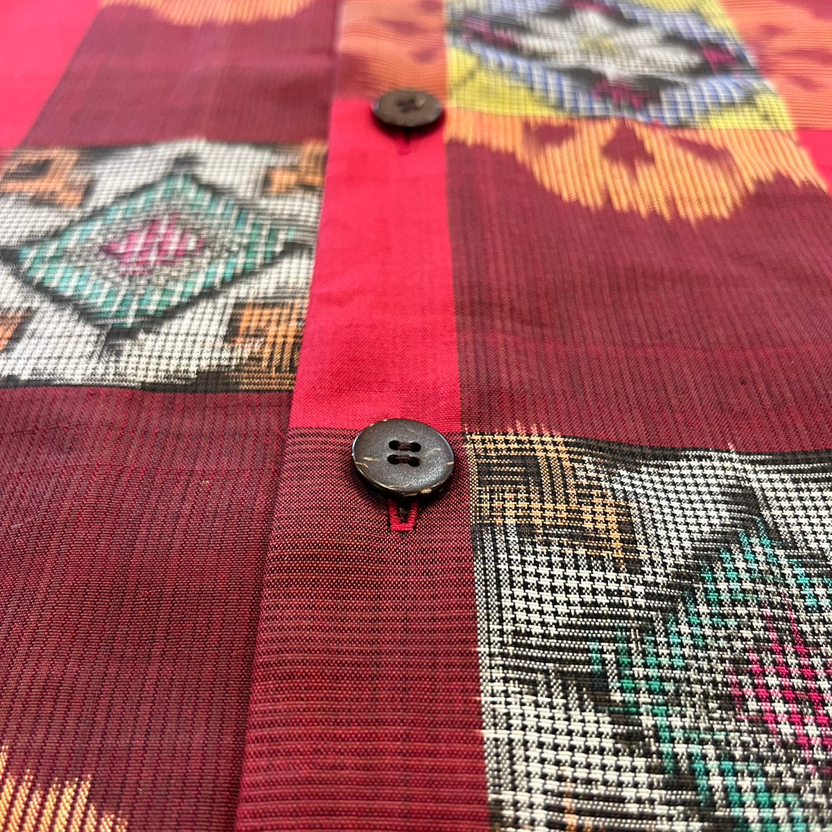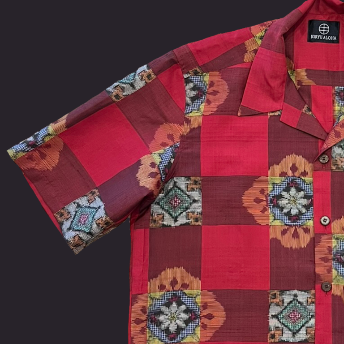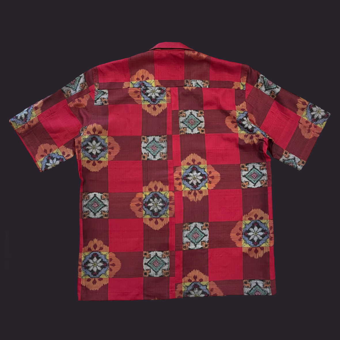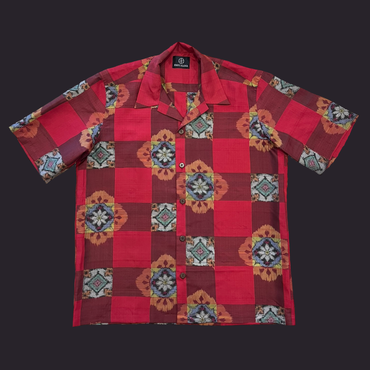 大ぶりの格子に規則的に華紋を配置した銘仙をアロハシャツに。