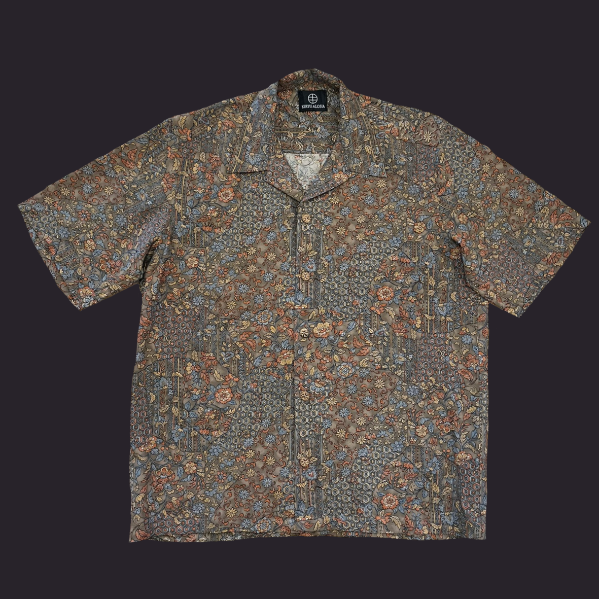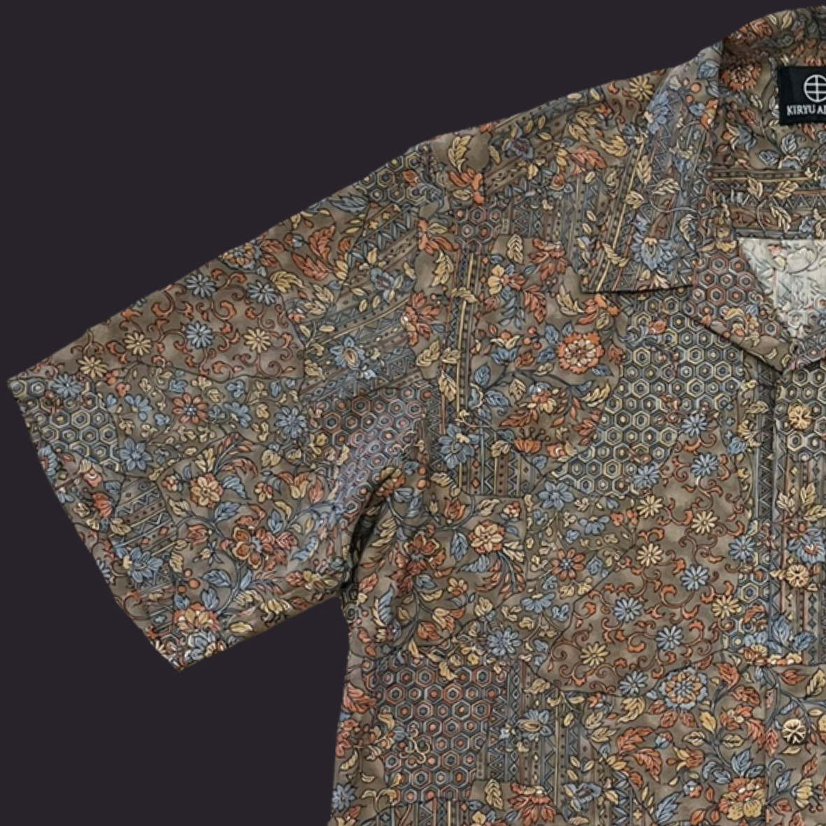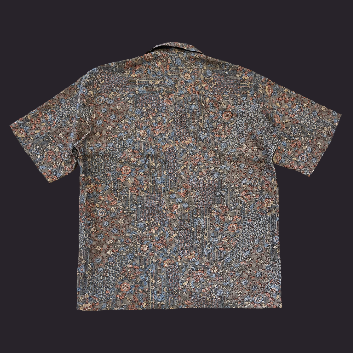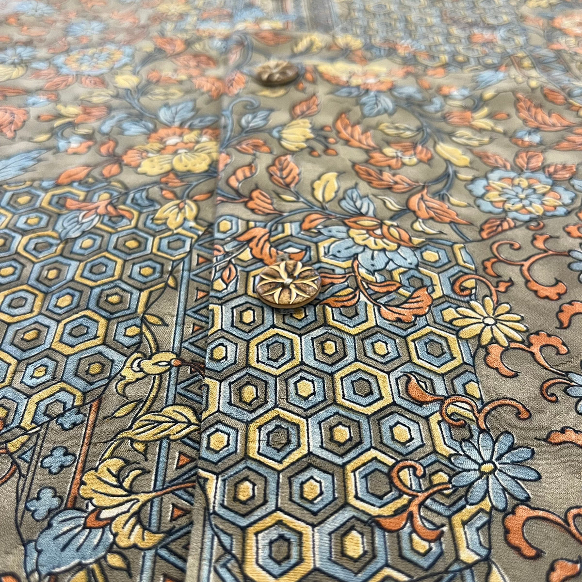 亀甲文様と更紗文様を敷き詰めた柄の小紋をアロハシャツに。
