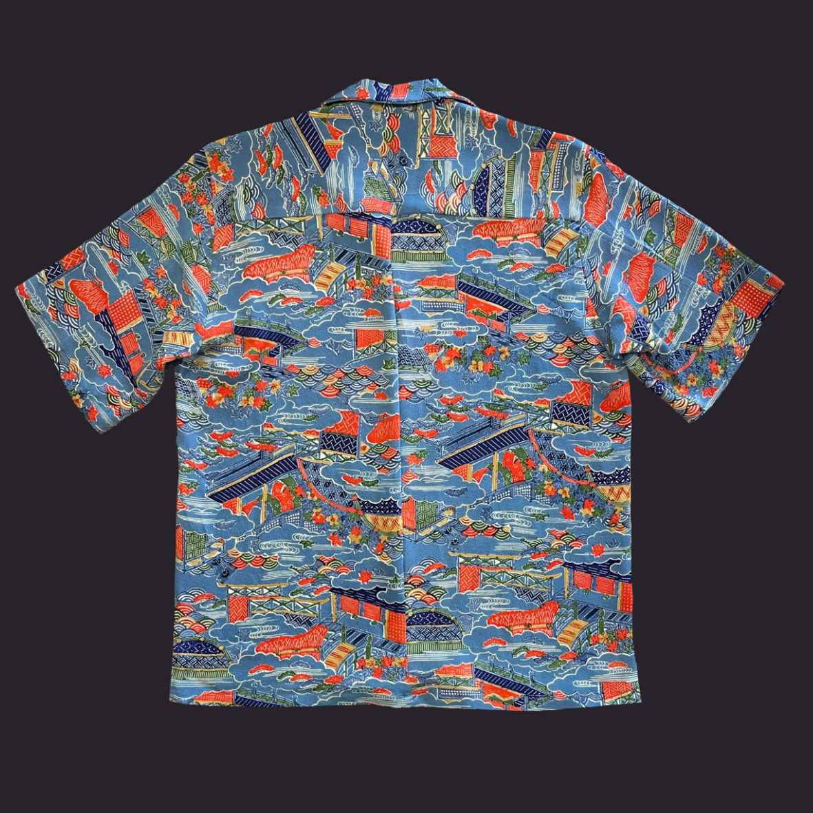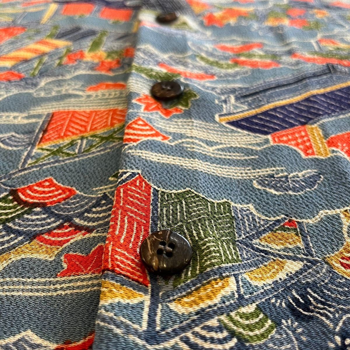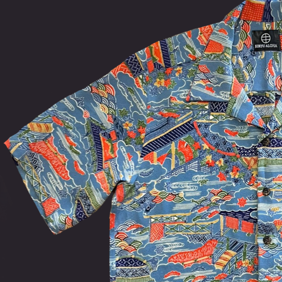 鮮やかな地色に御所解き文様をあらわした小紋をアロハシャツに。
