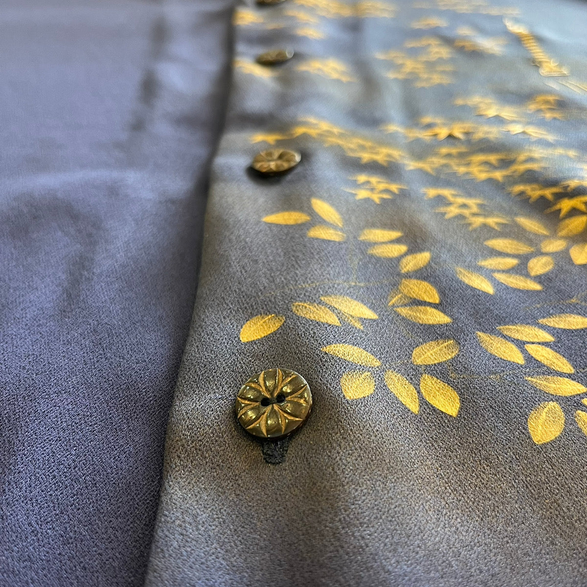 金彩と刺繍で古塔と木々を表現した訪問着をアロハシャツに。