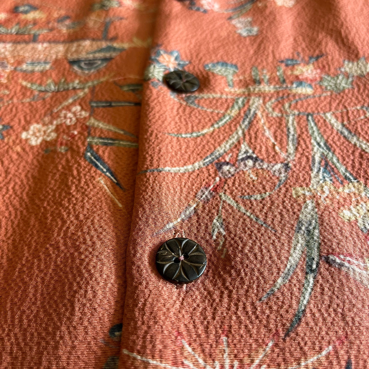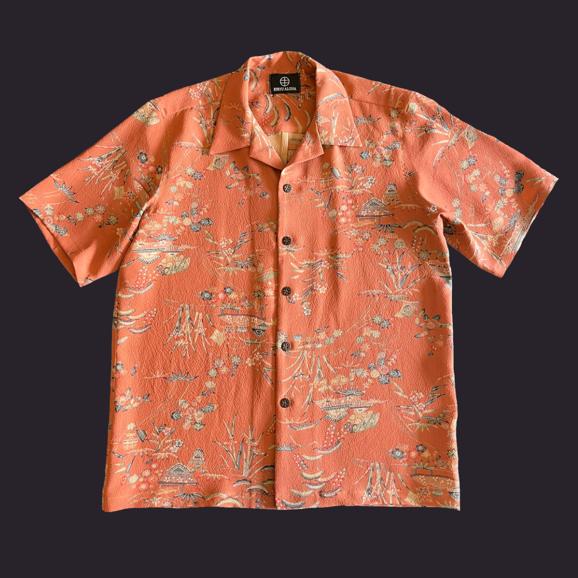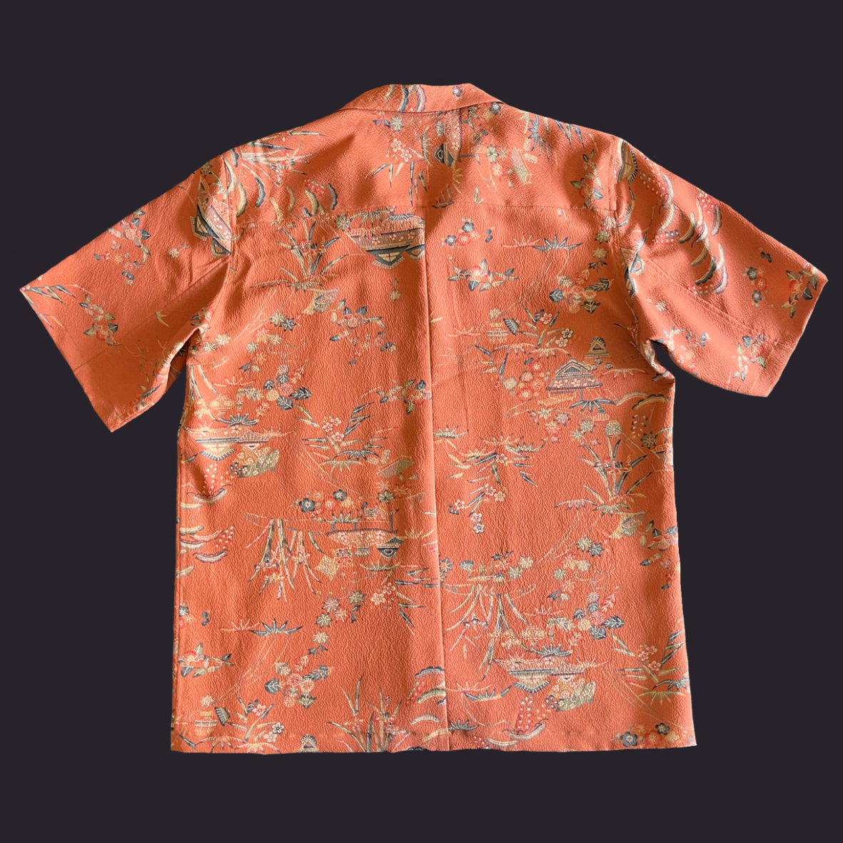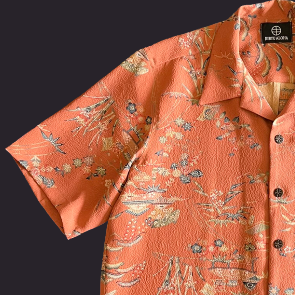 型染で茶屋辻文様を全体に染めた小紋をアロハシャツに。