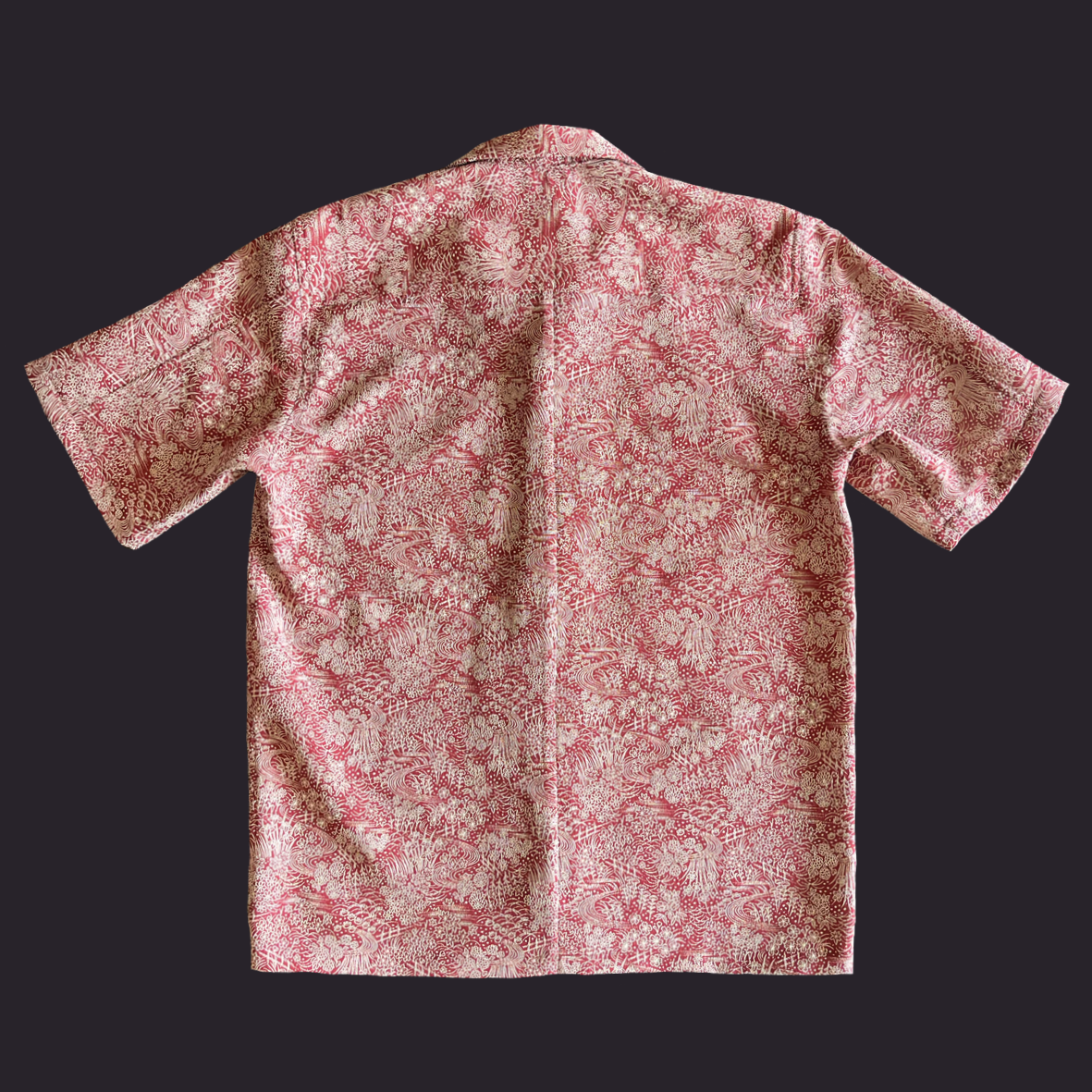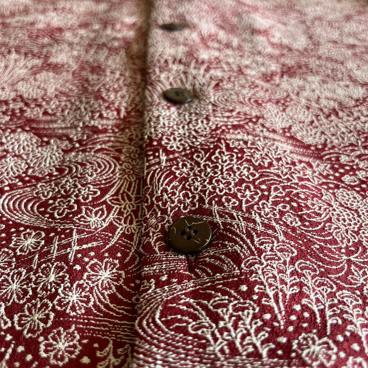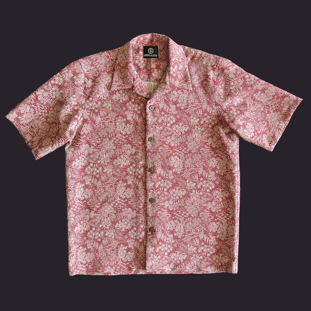 織りで細やかな文様を織り出した着物をアロハシャツに。
