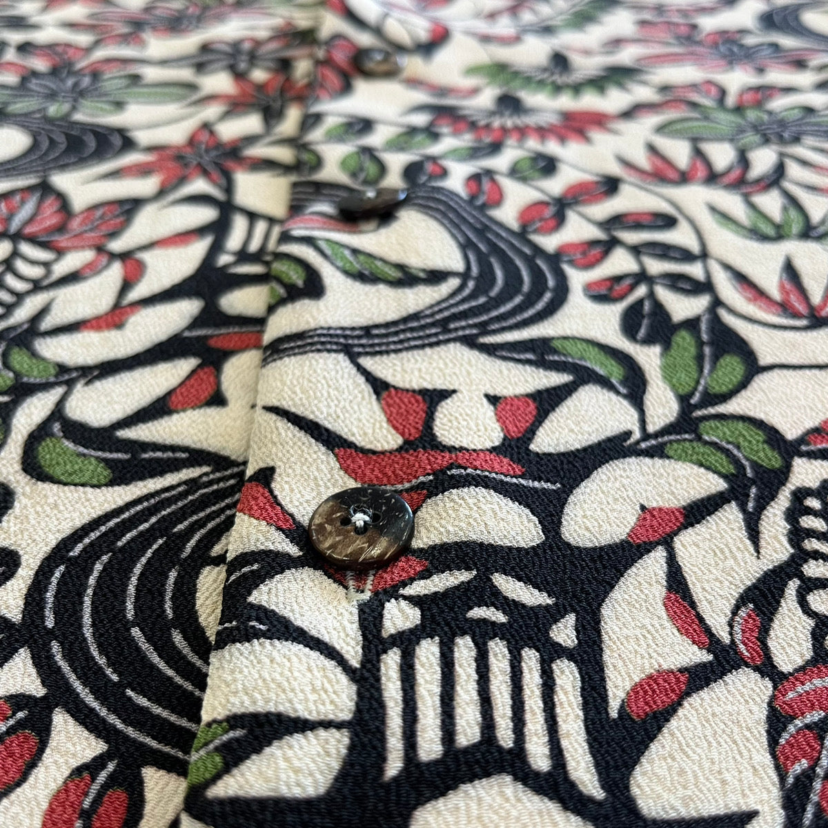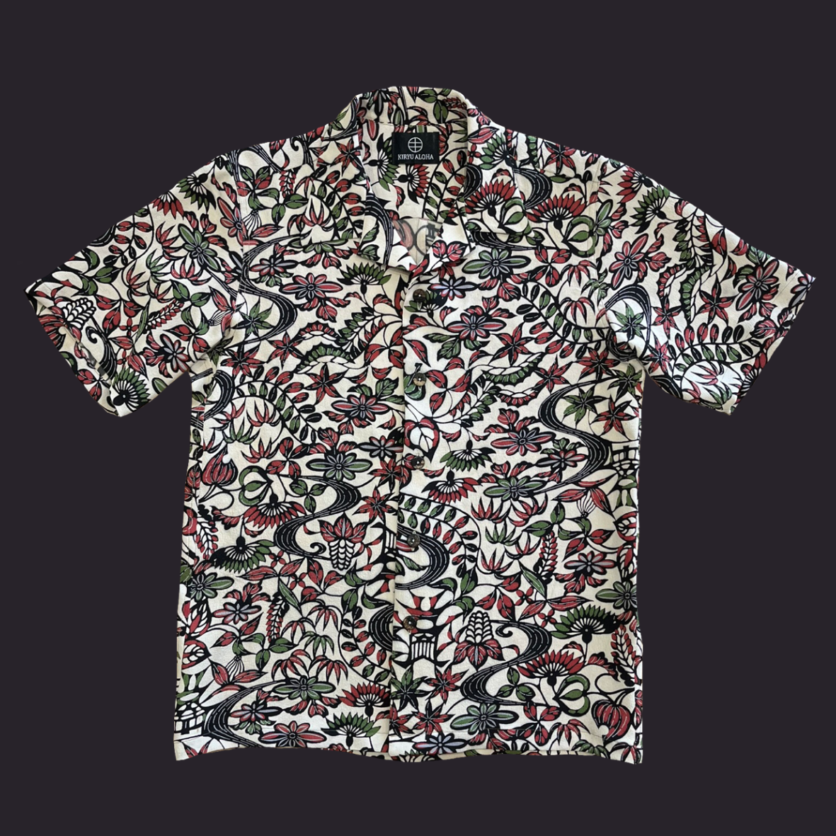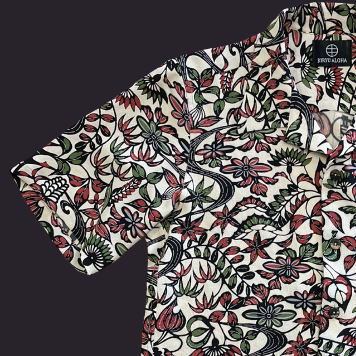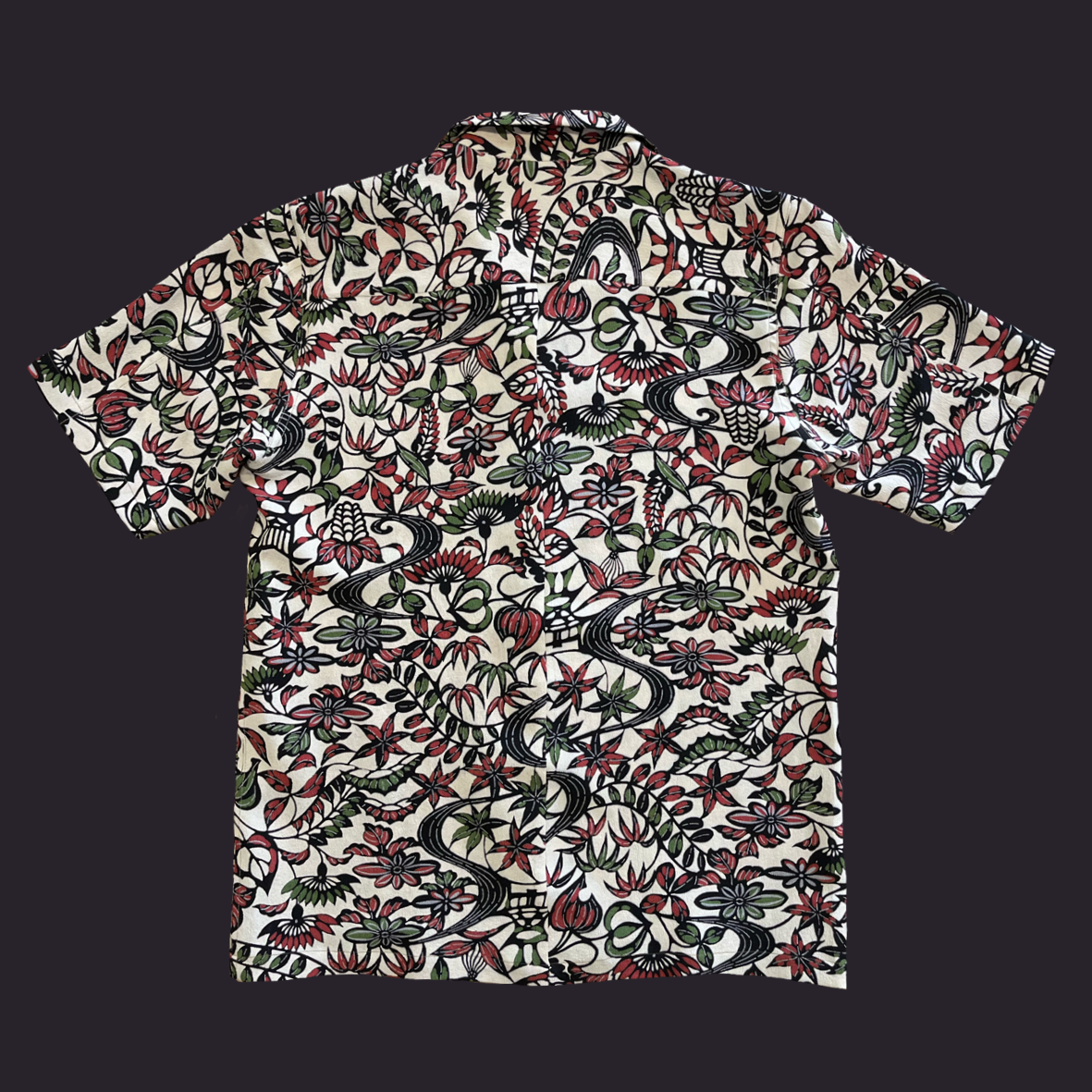型染で花々と流水を鮮やかに表現した小紋をアロハシャツに。