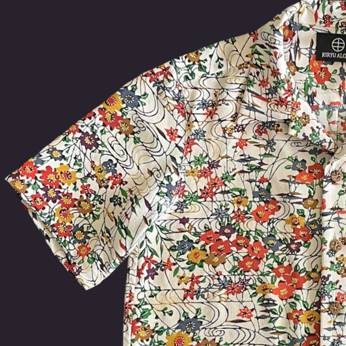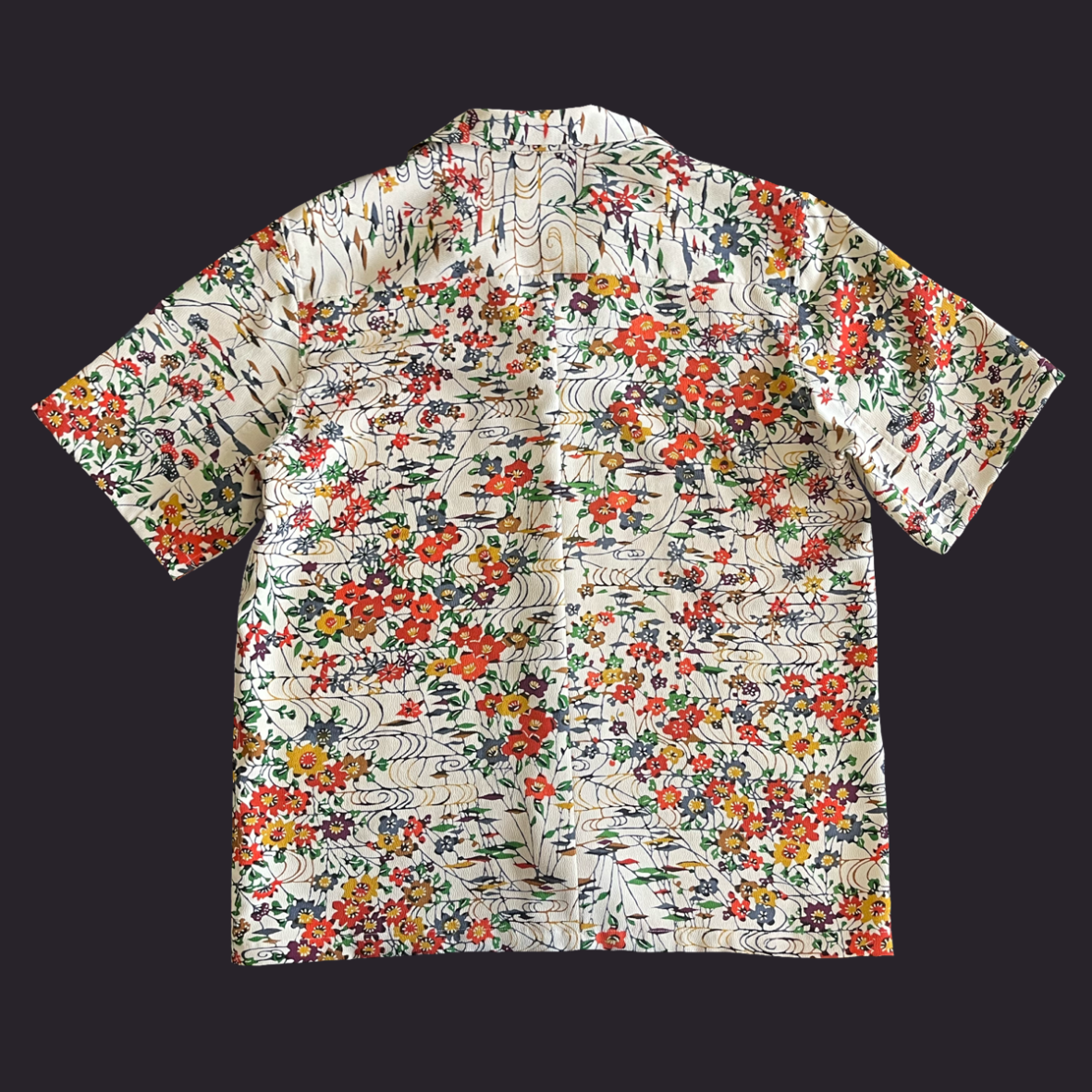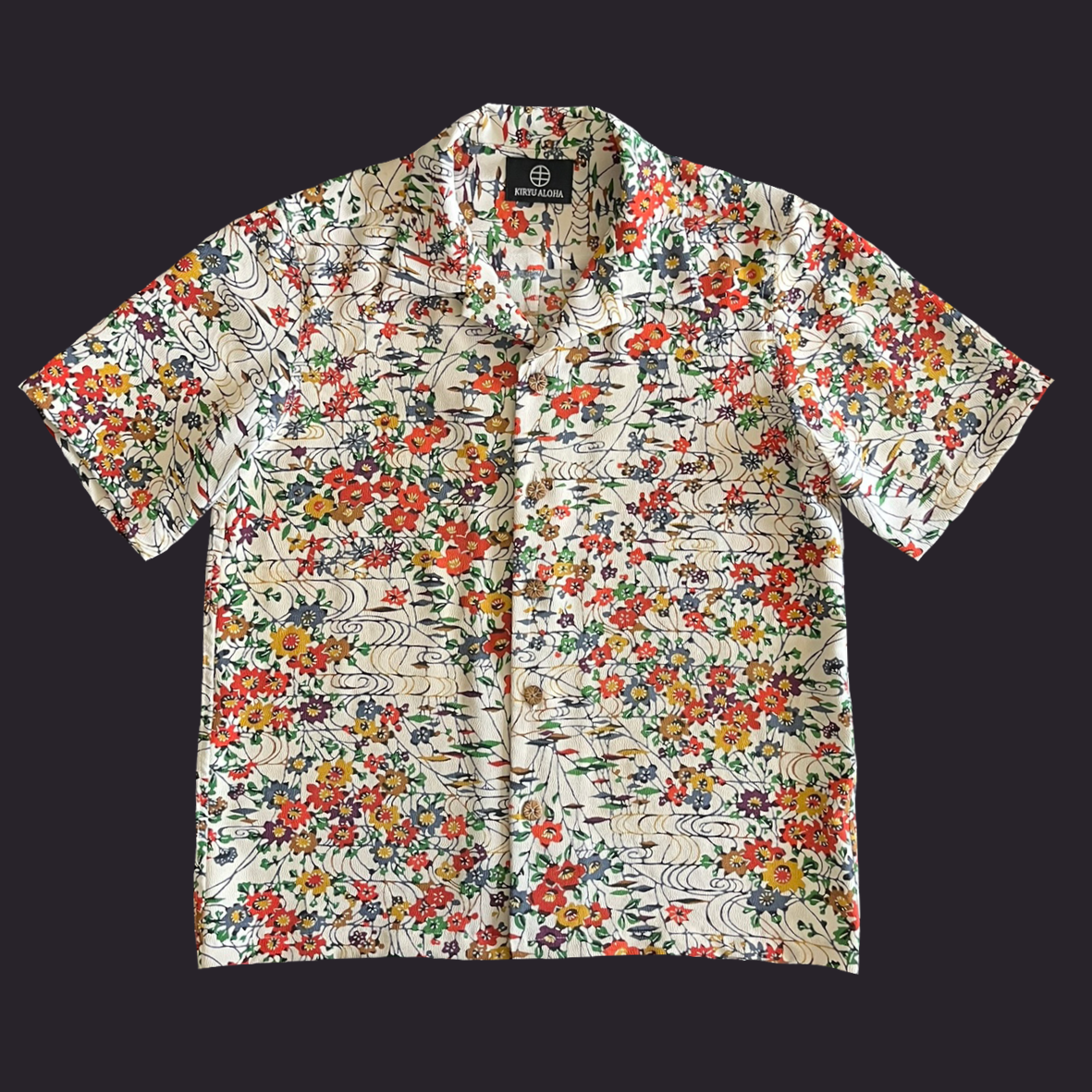 型染で花々と観世水文様を染めた小紋をアロハシャツに。