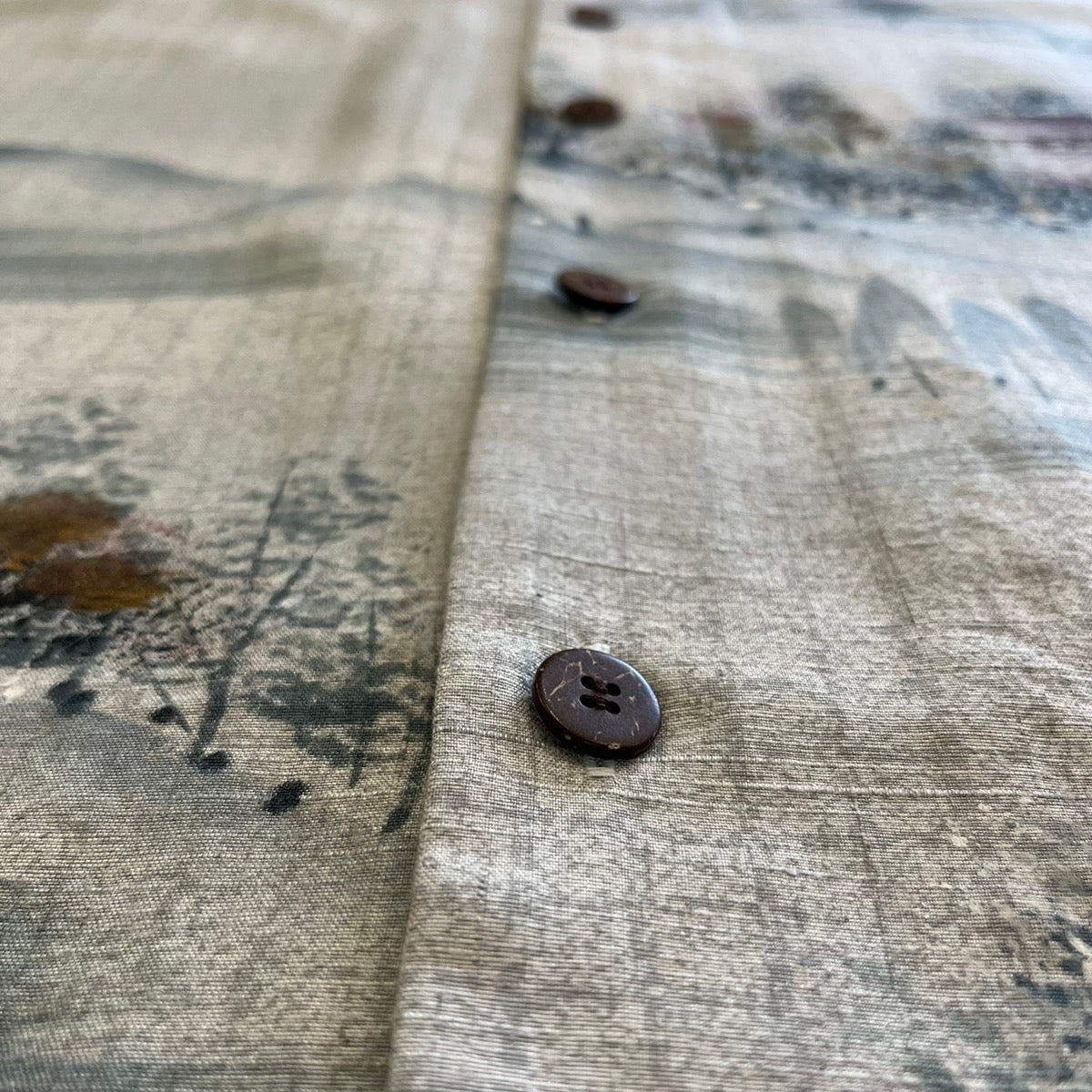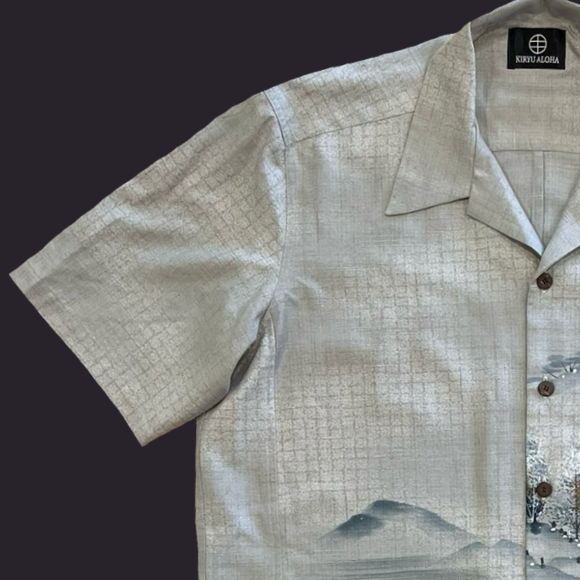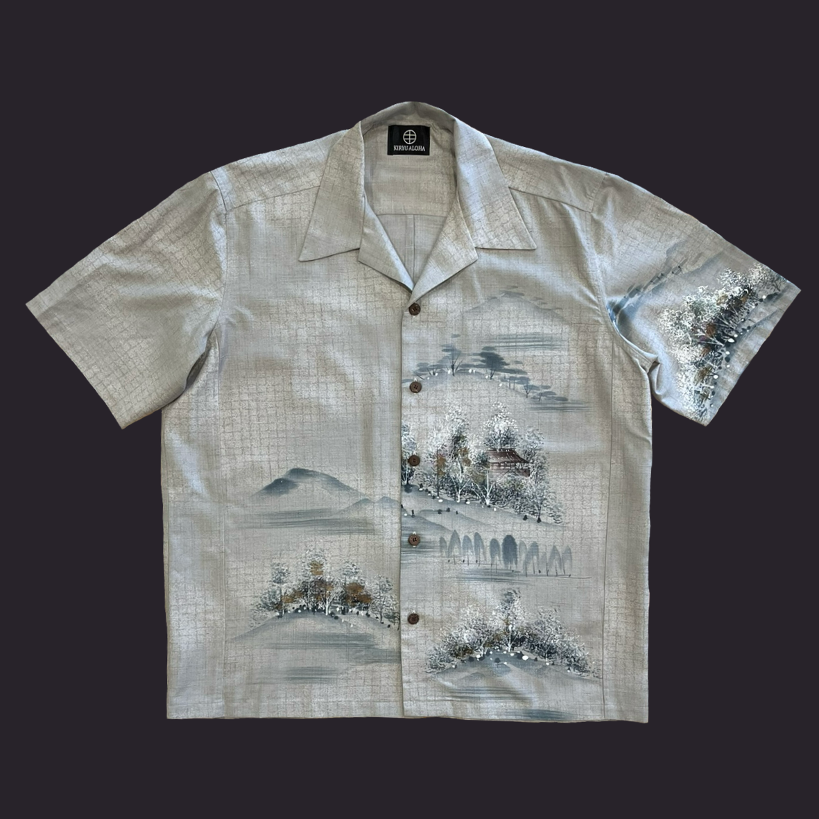 山々とその麓に佇む屋敷を描いた訪問着をアロハシャツに。