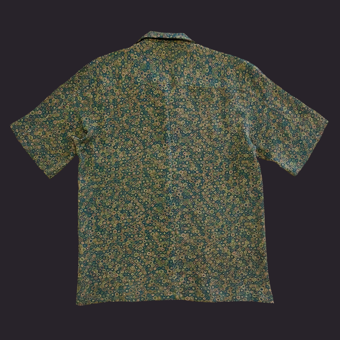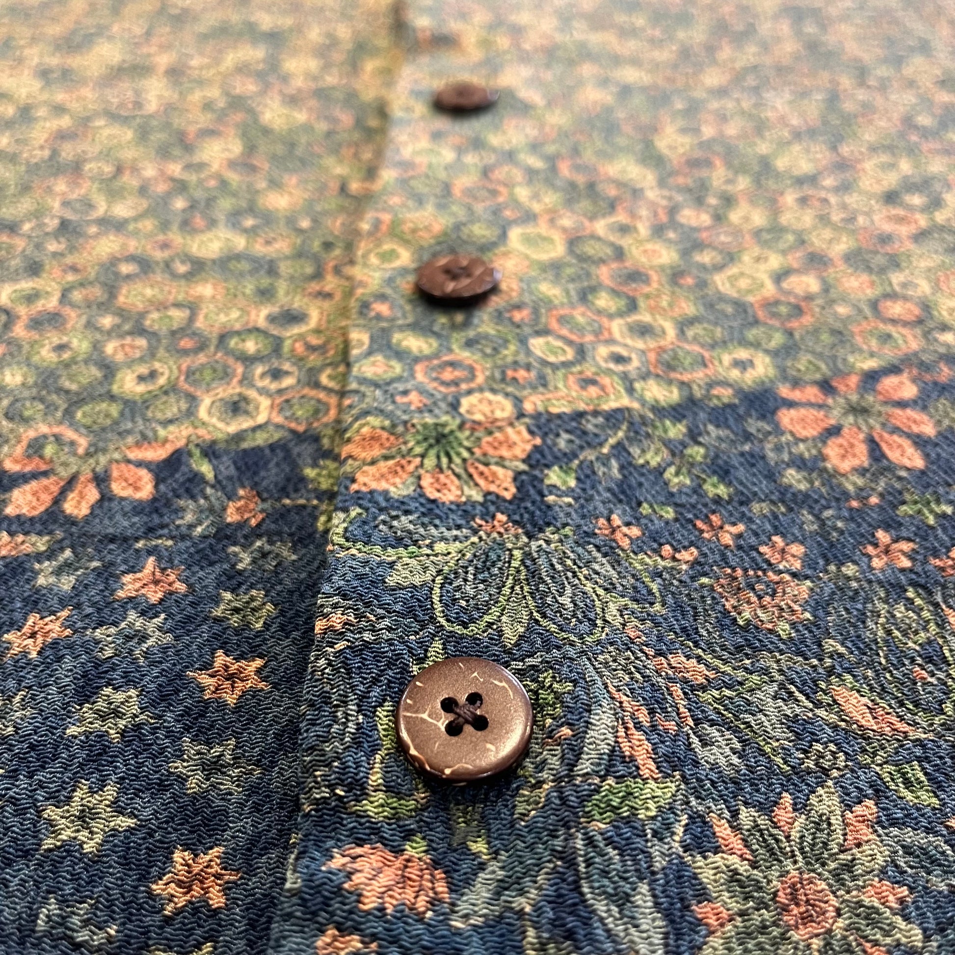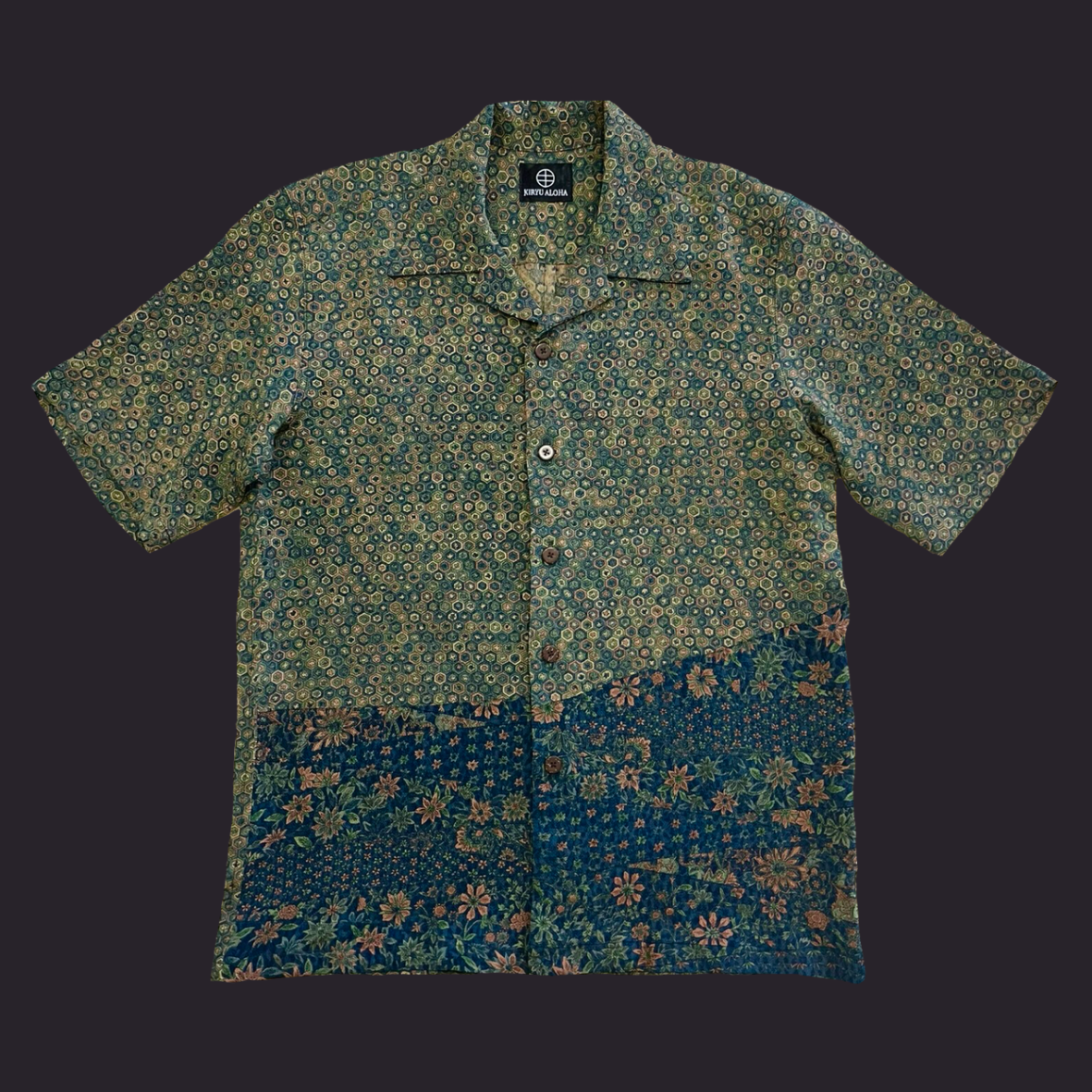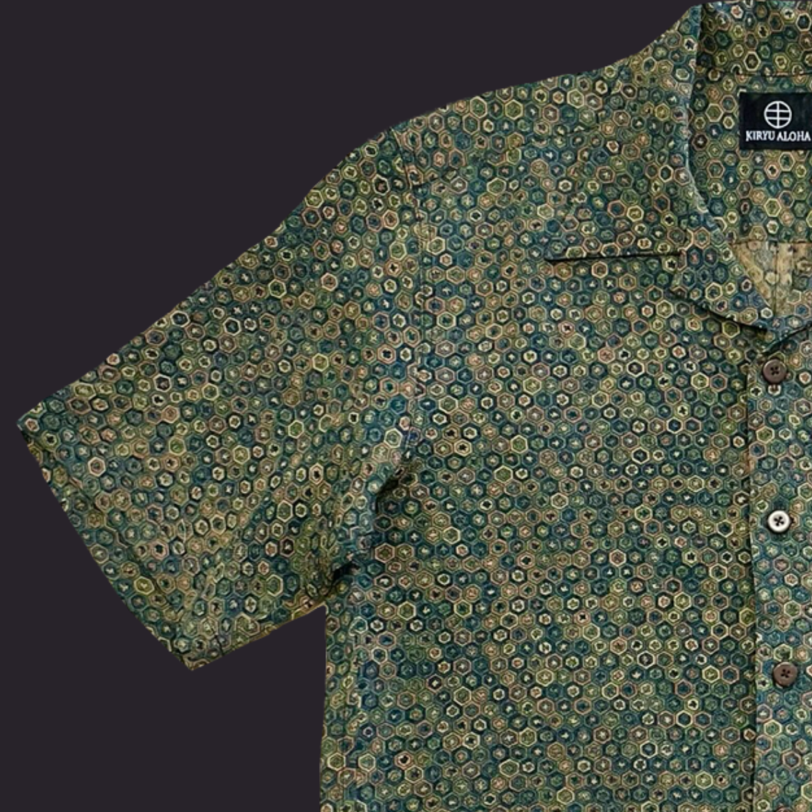 子持ち亀甲繋ぎ文様と更紗文様をあらわした小紋をアロハシャツに。