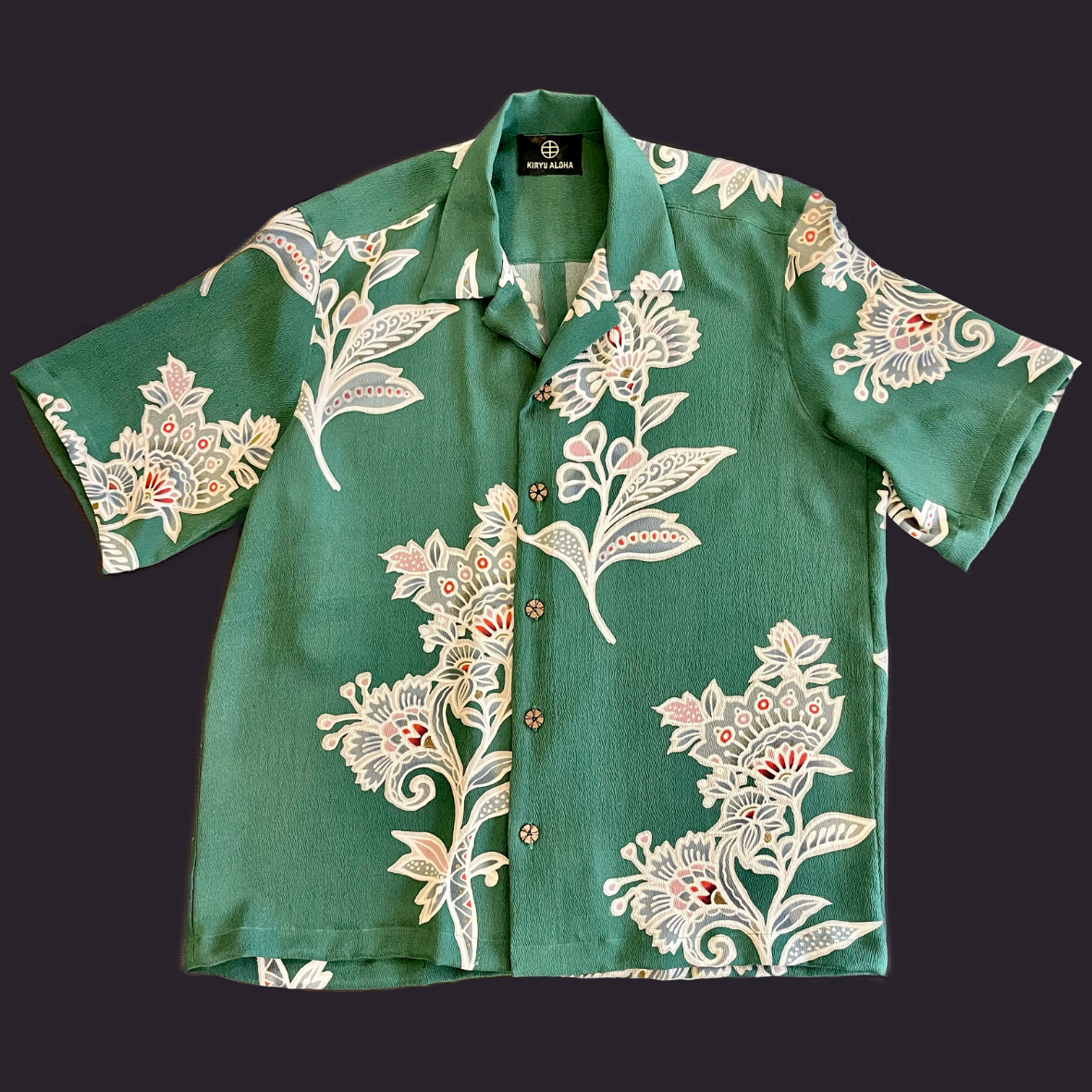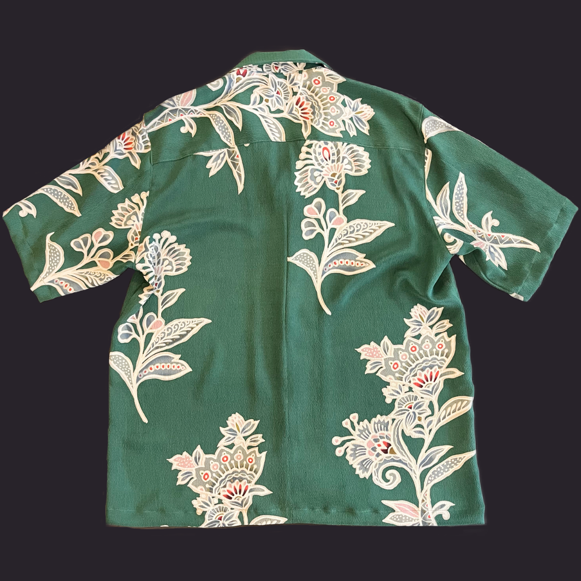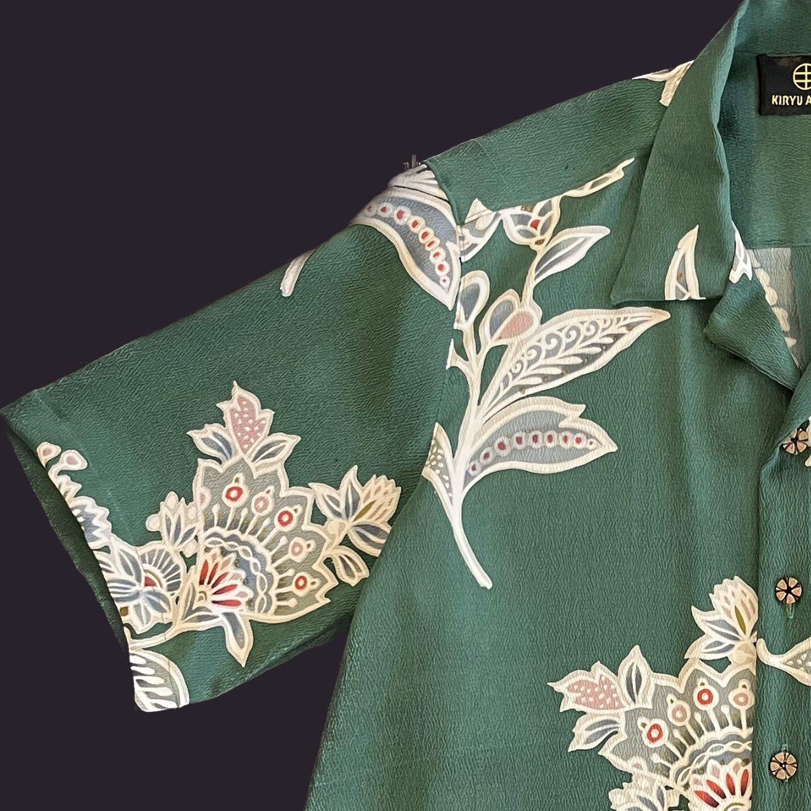 こちらは昭和中期の着物で、昭和モダンの雰囲気を感じさせる鮮やかな緑色に大胆に手書きで描かれた更紗紋様が魅力的です。