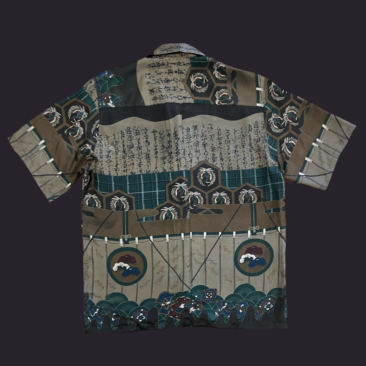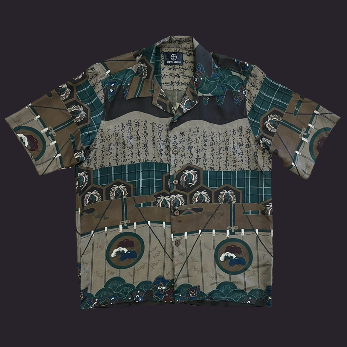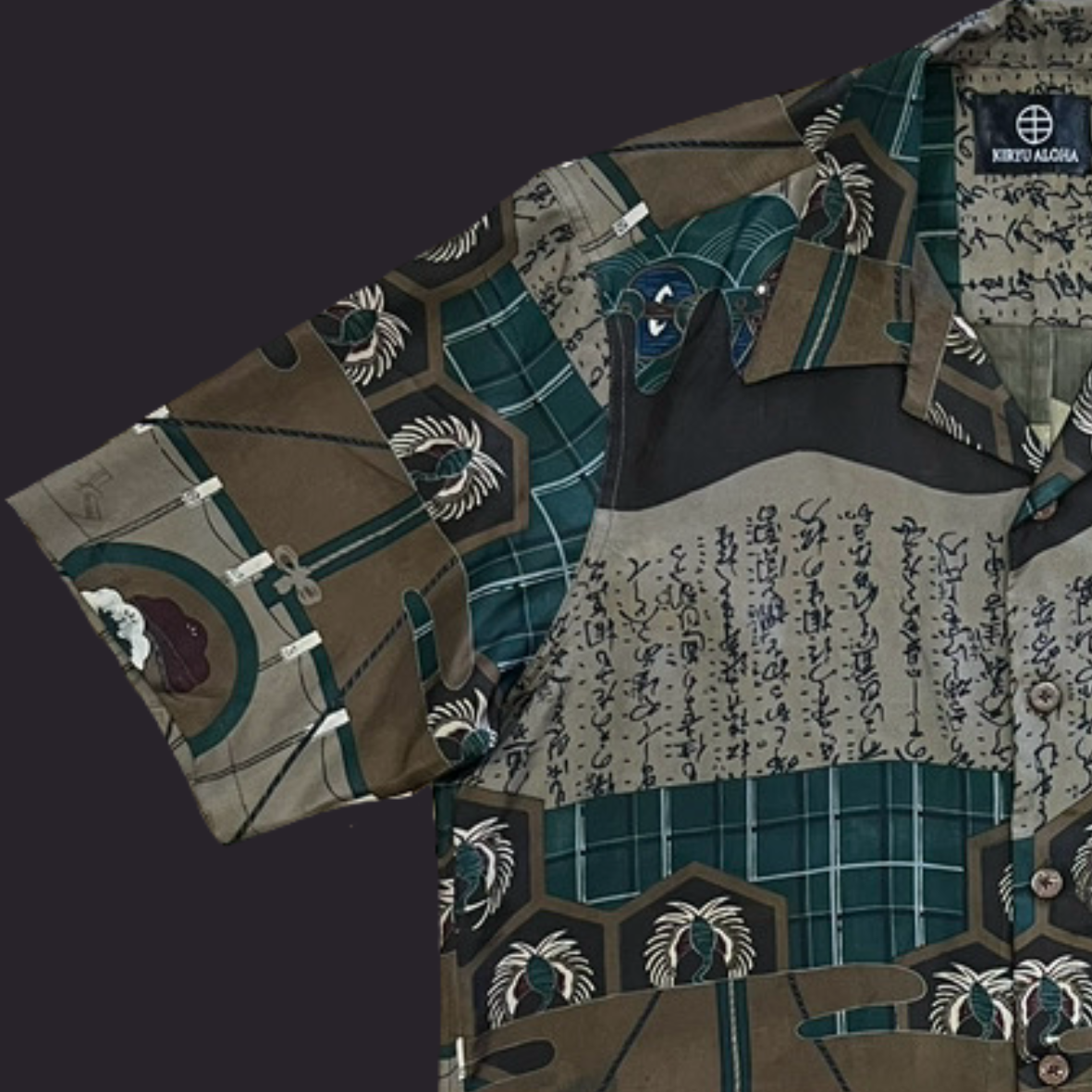 型染で亀甲文様や帆、丸に三階松紋などを表現した長襦袢をアロハシャツに。