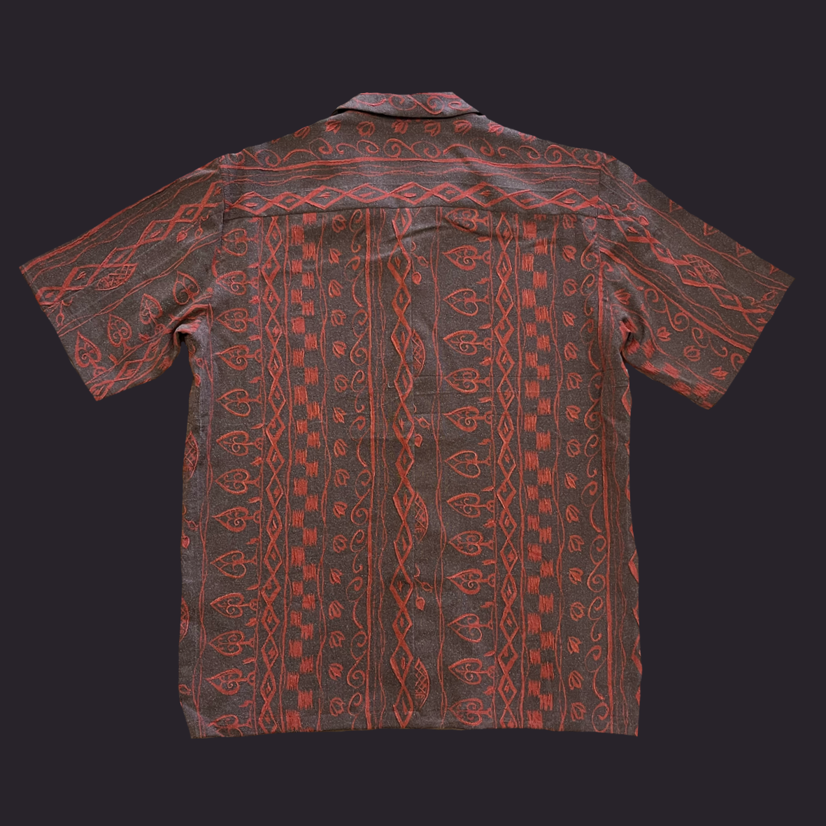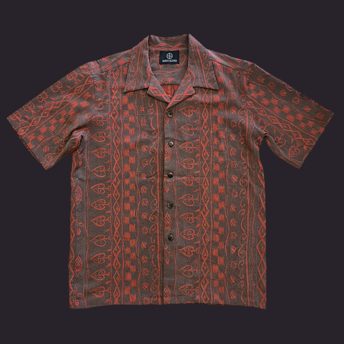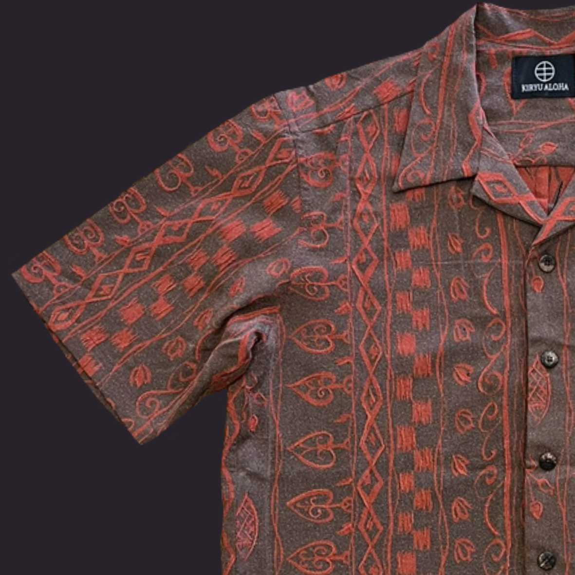 連続した木立文様や菱文様を織り出した着物をアロハシャツに。