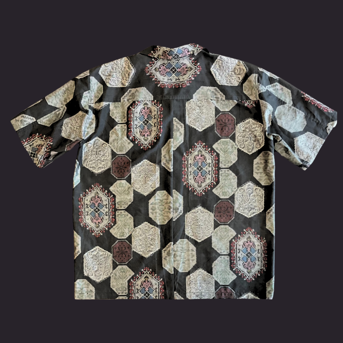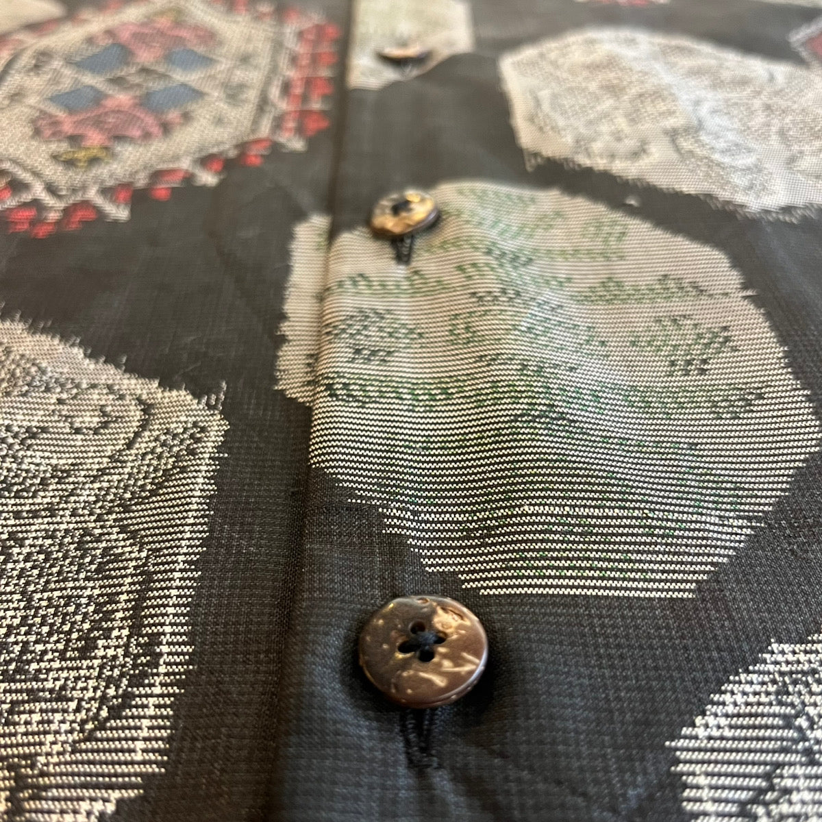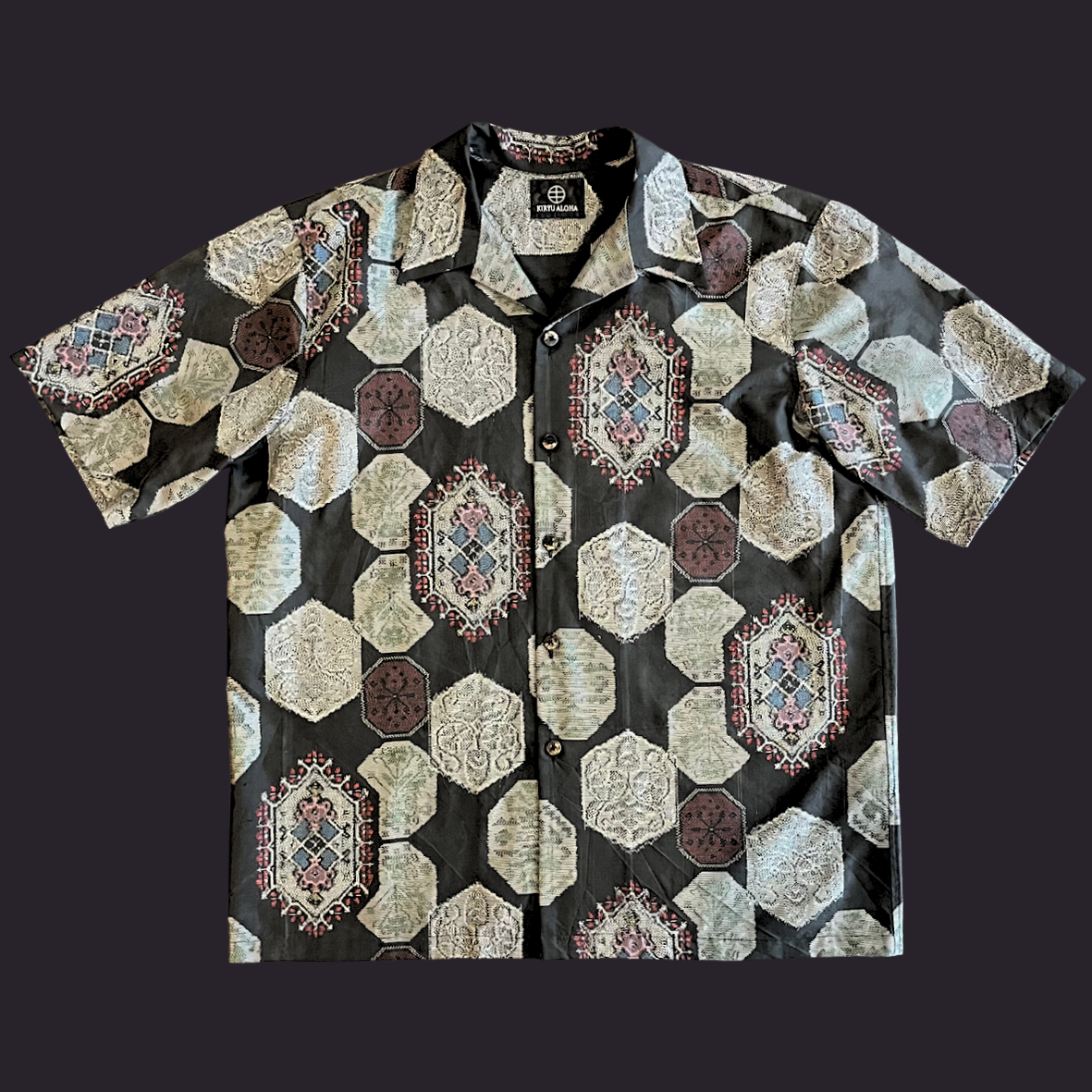 亀甲文様を全体に織り出した大島紬をアロハシャツに。