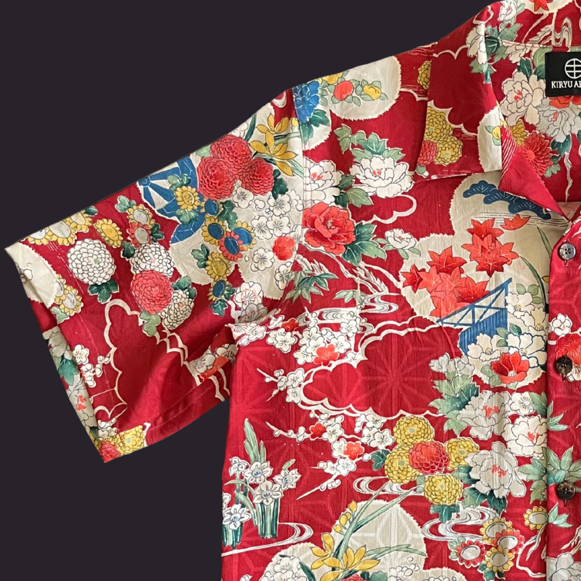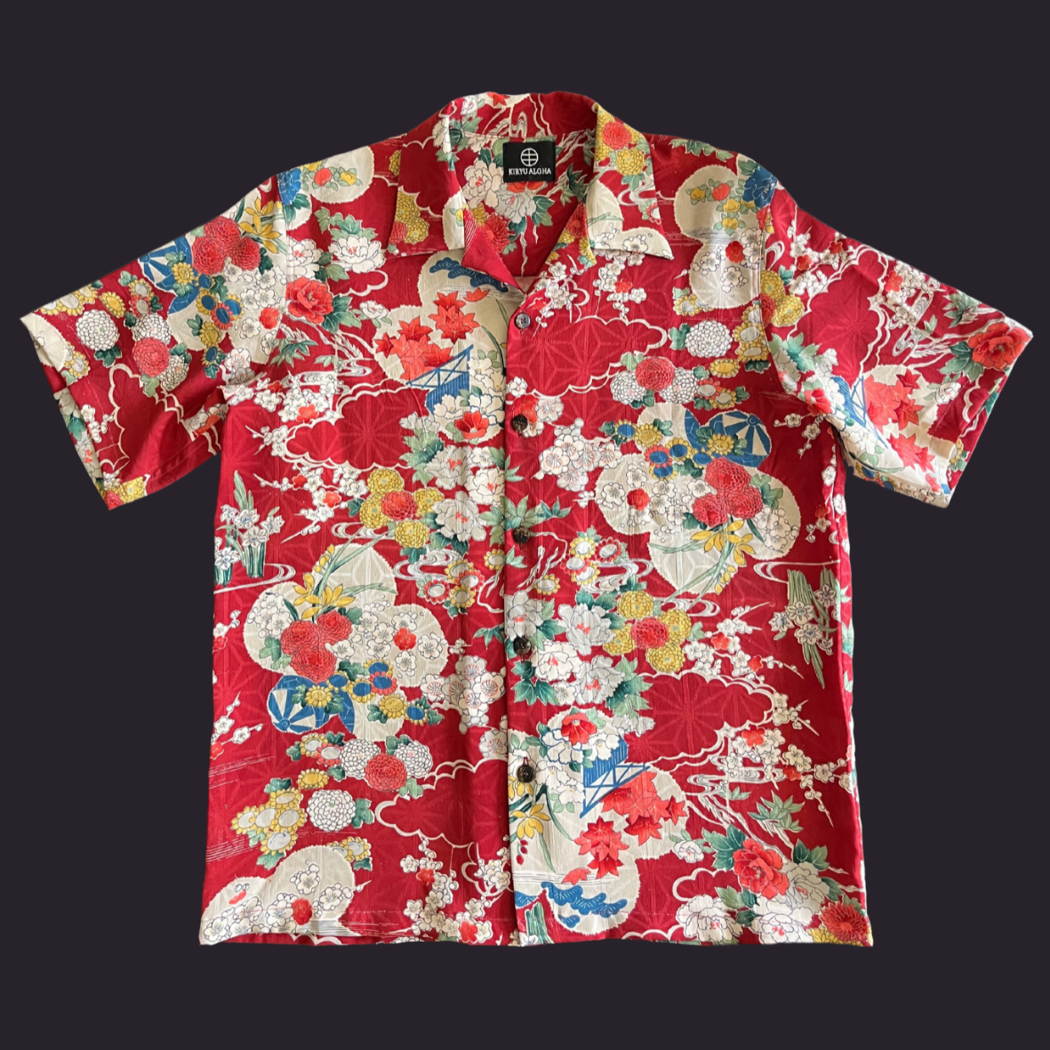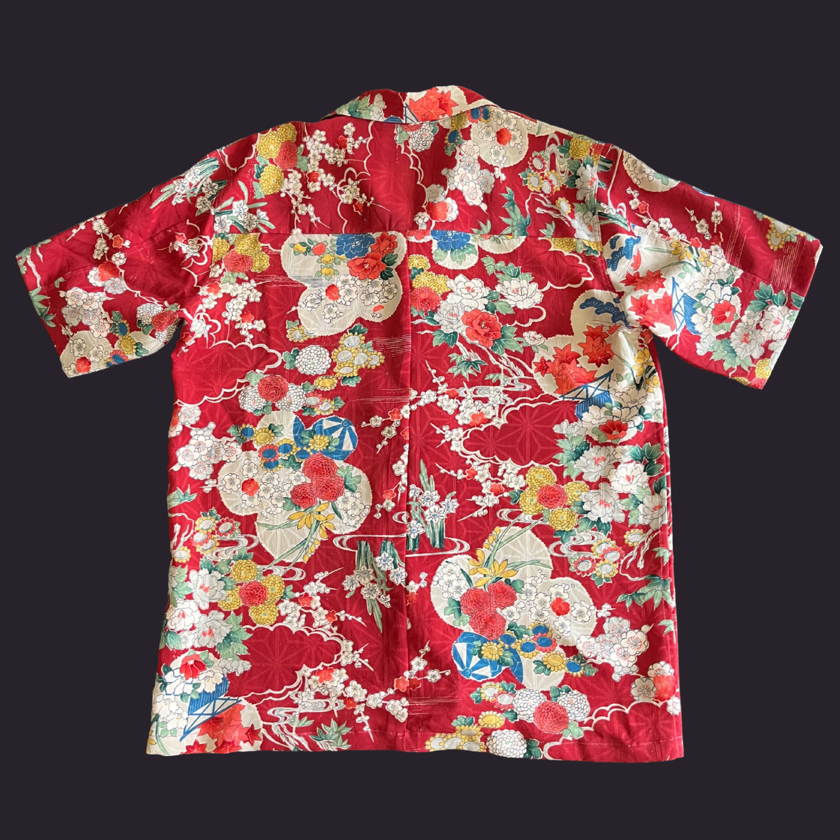 型染で吉祥文様を全体に染めた小紋をアロハシャツに。