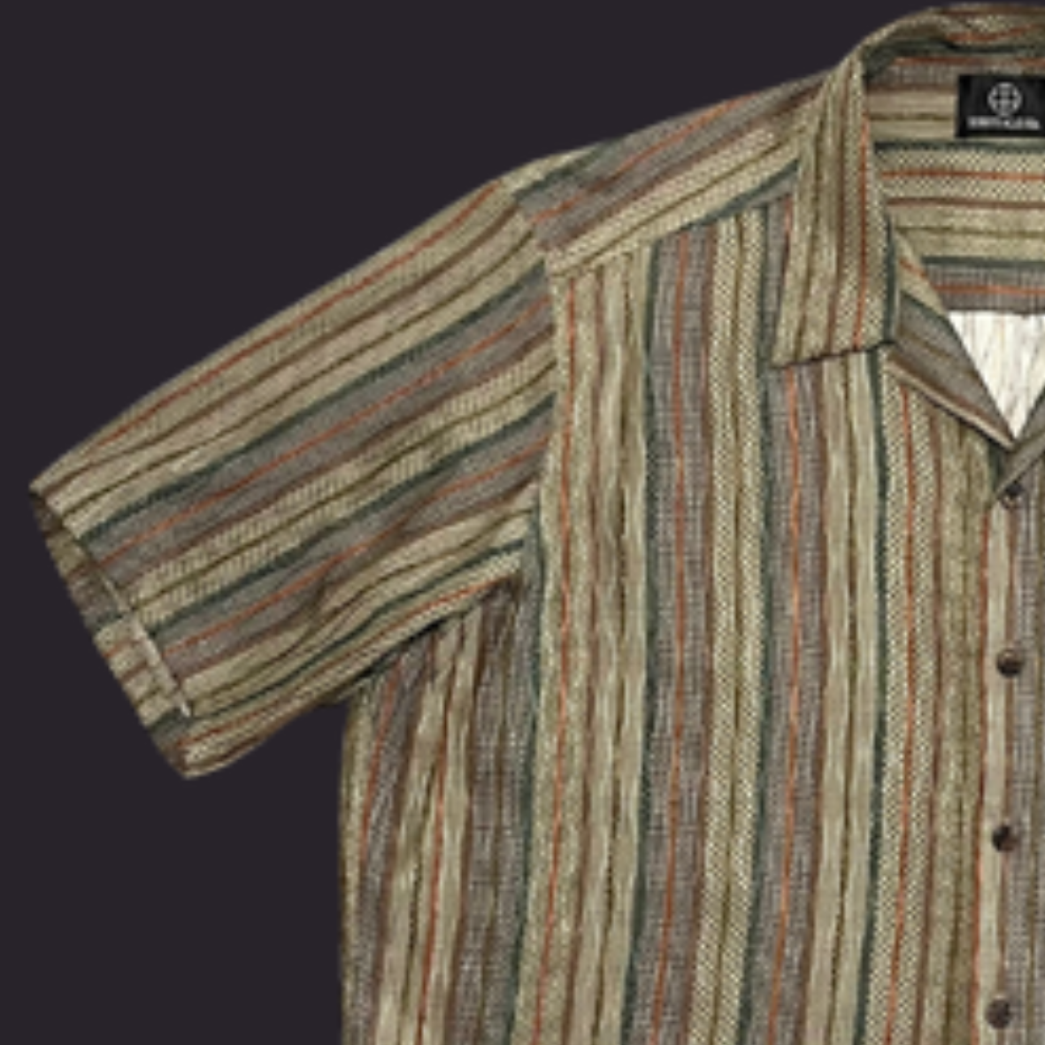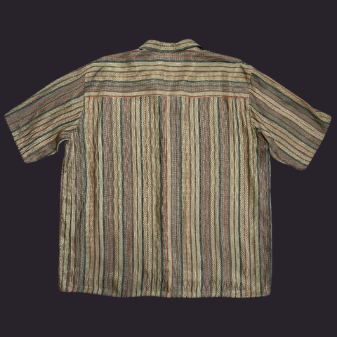 型染で細縞を染めた小紋をアロハシャツに。縞それぞれに極細やかな文様が入れ込まれています。
