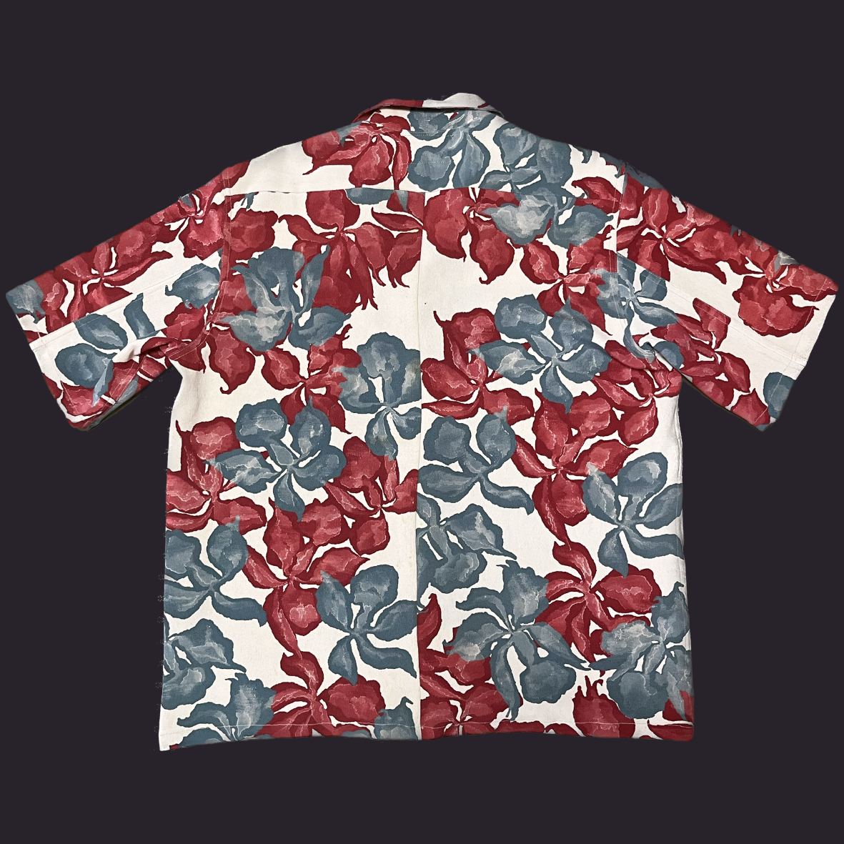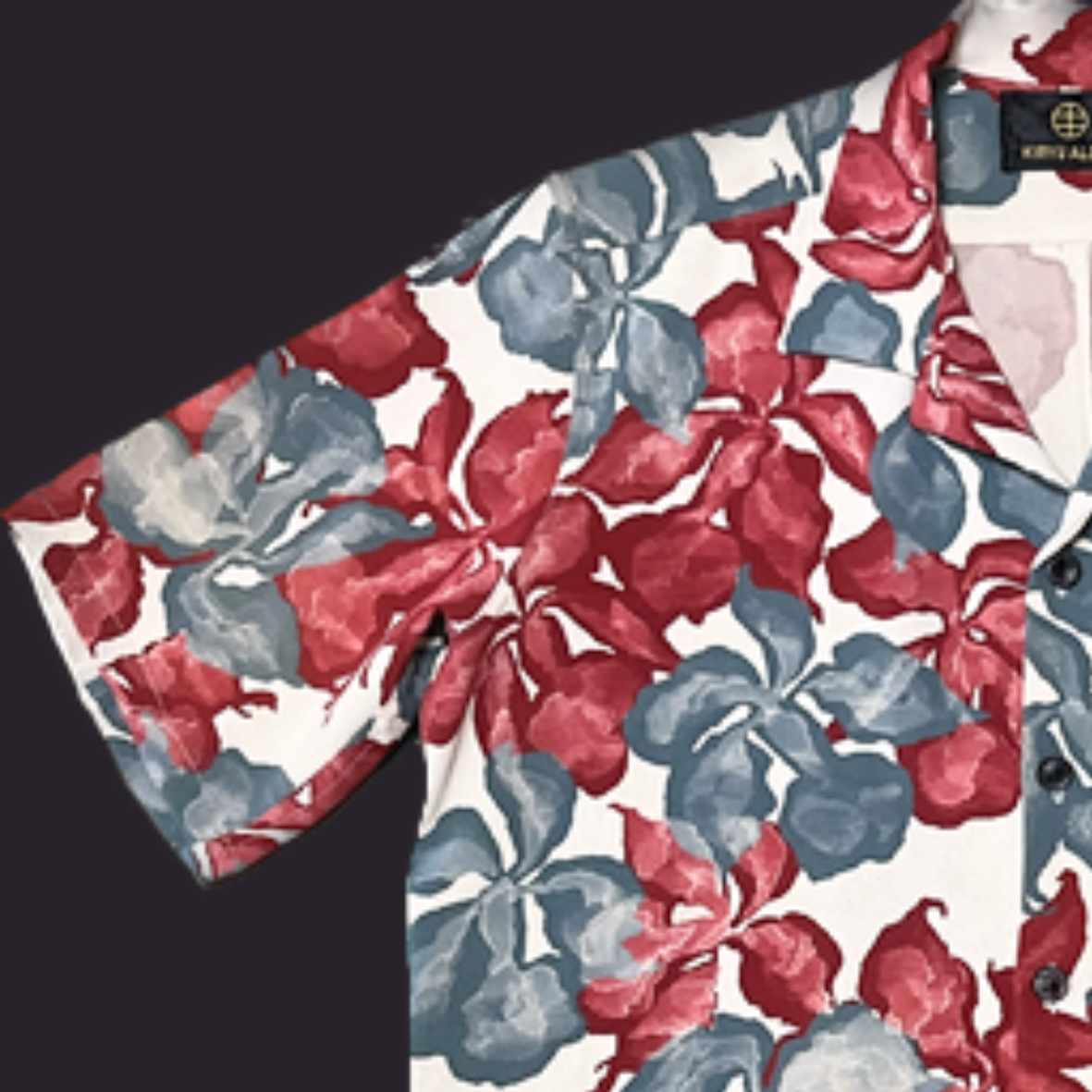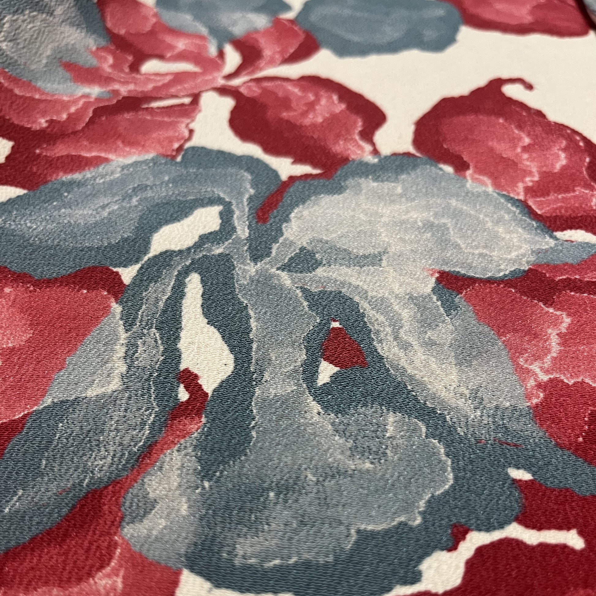 菖蒲(しょうぶ)の花弁のシルエットを赤青の二色を使って描いた小紋から。