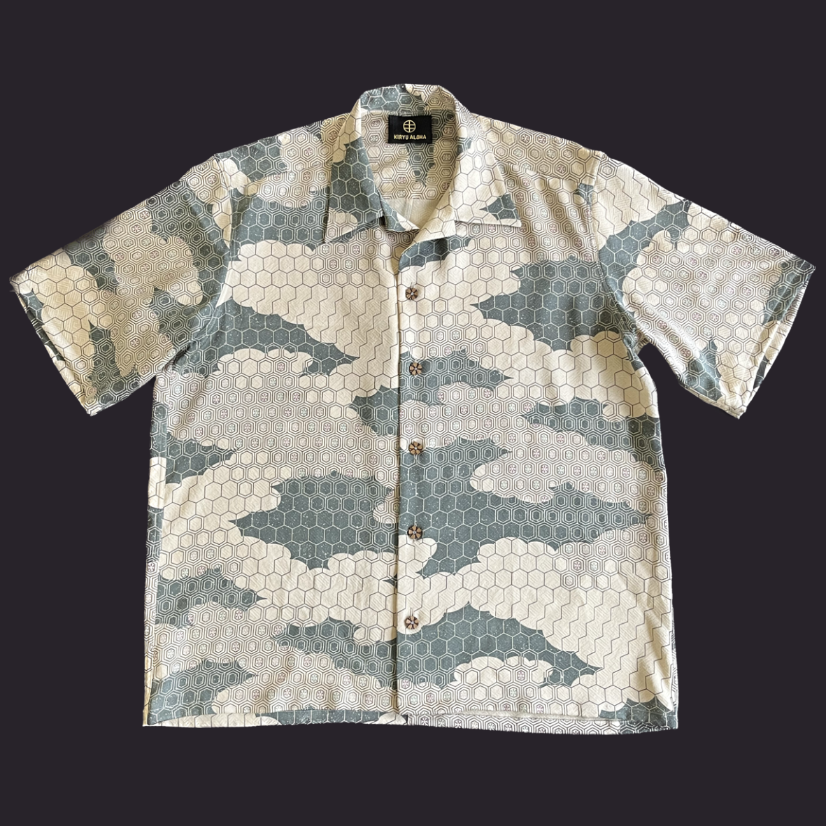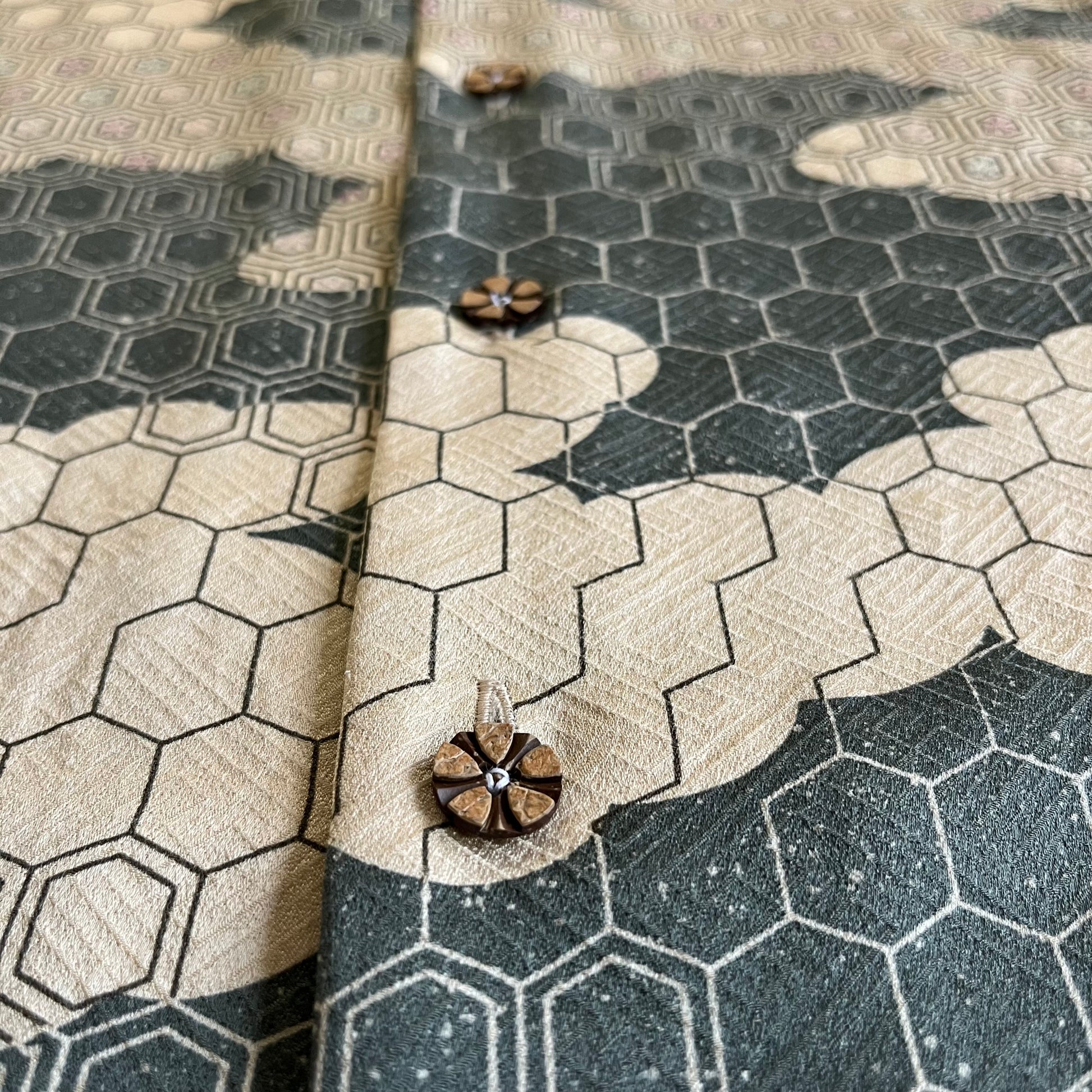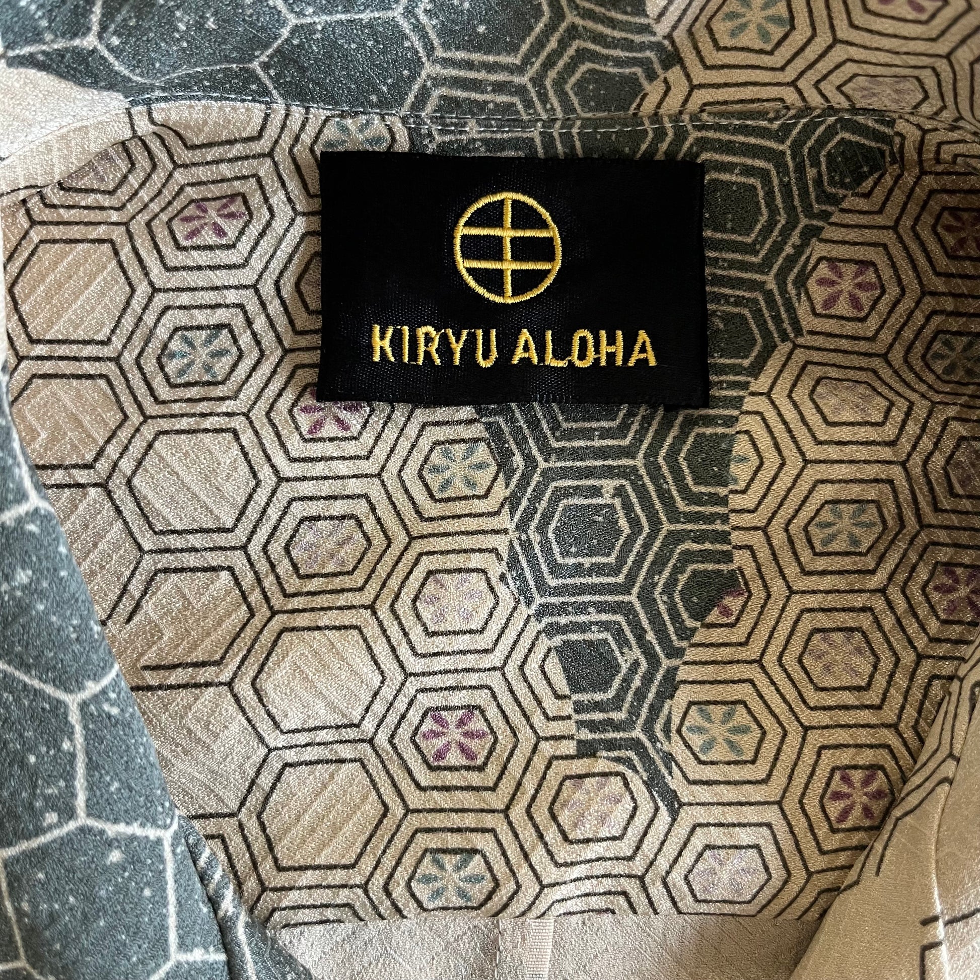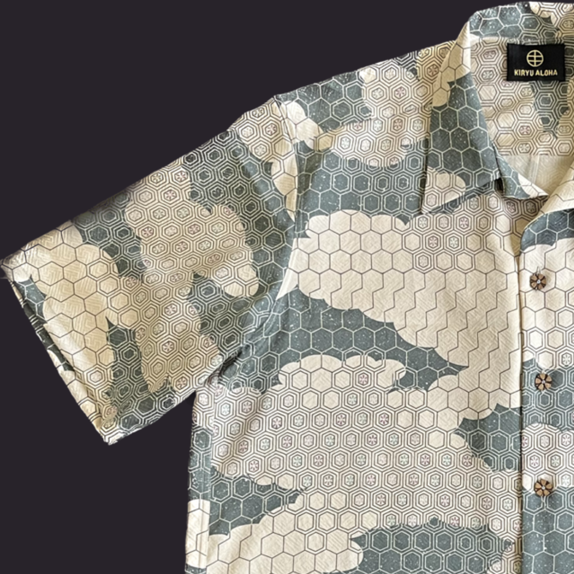 型染で大きな雲取りに亀甲文様を重ねた柄の着物をアロハシャツに。