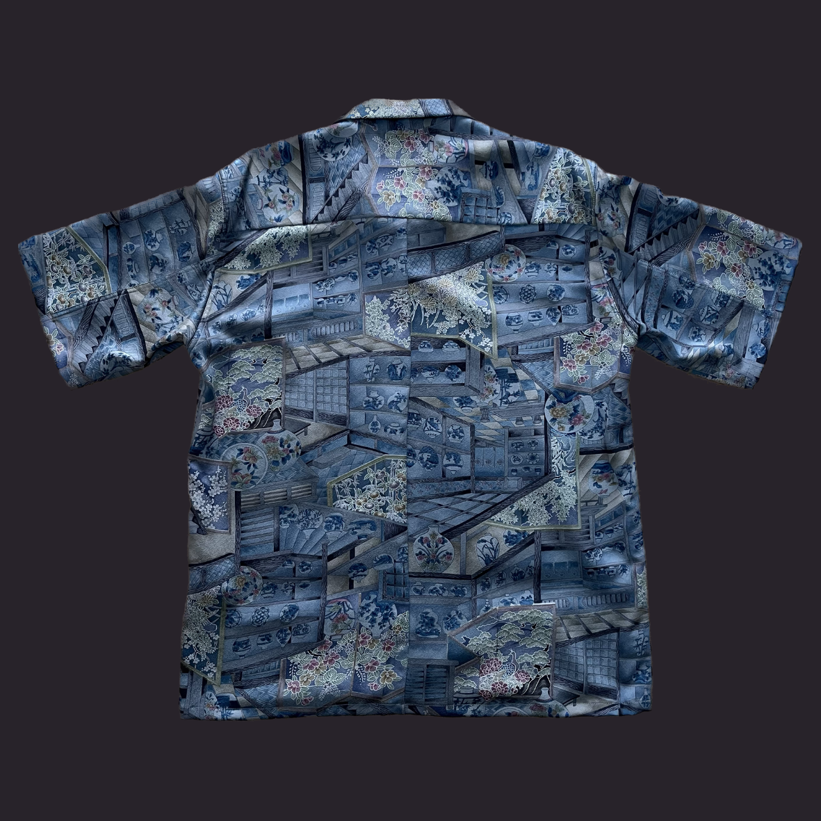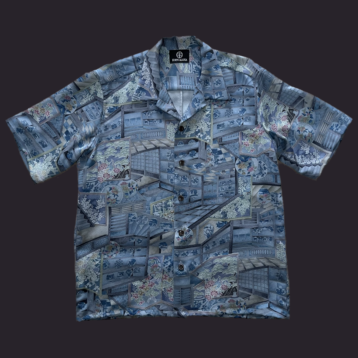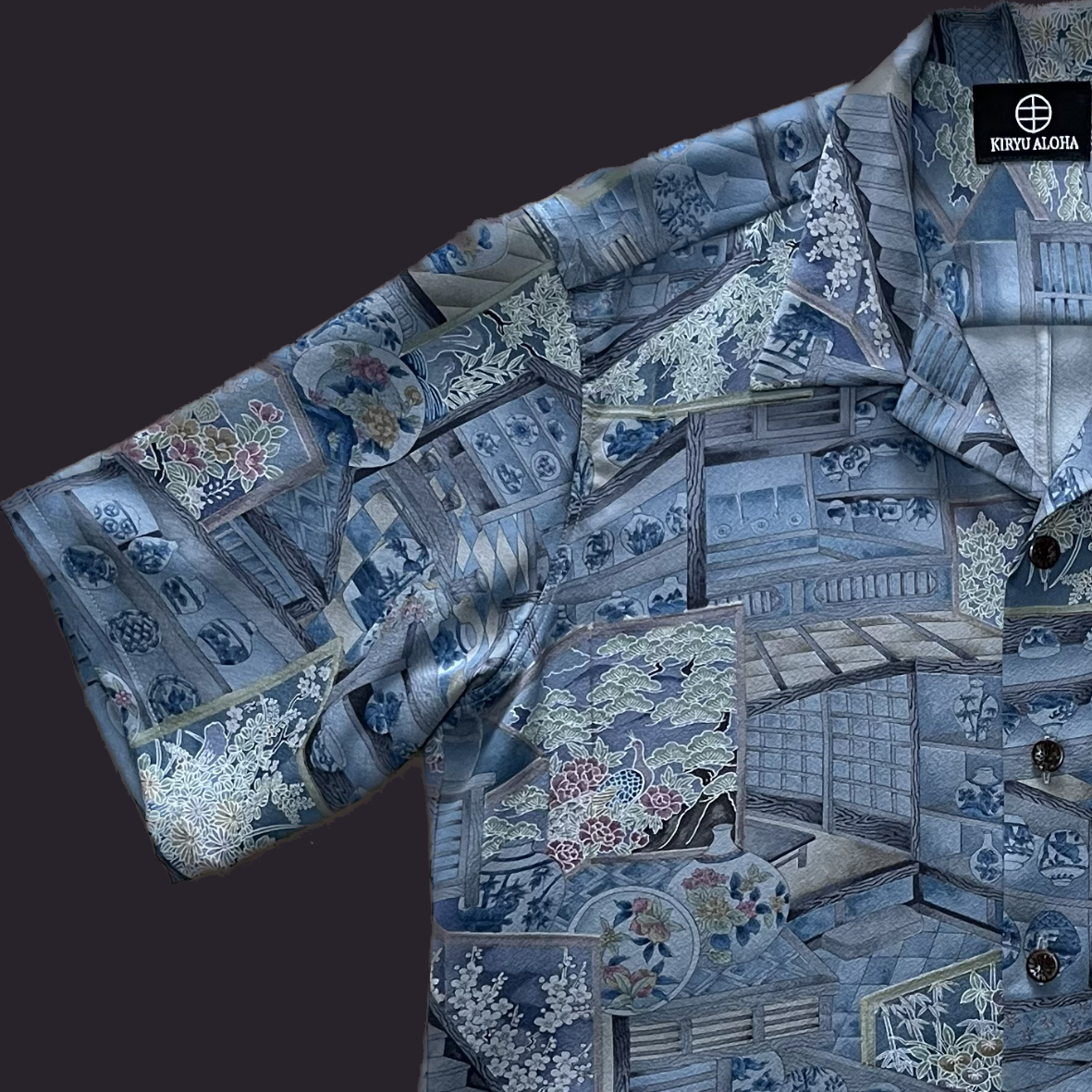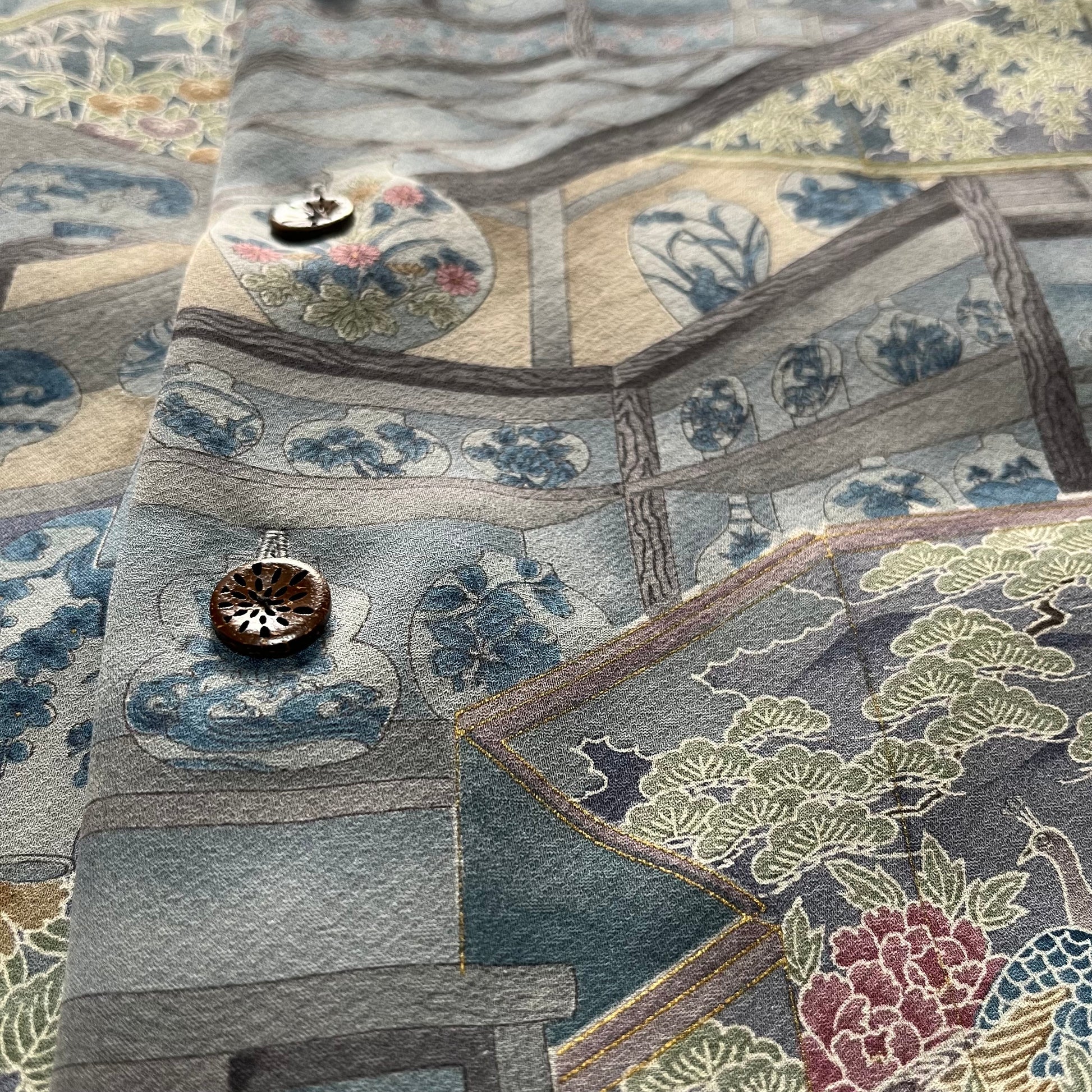 壺がたくさん並ぶ店内の様子を表現した小紋をアロハシャツに。