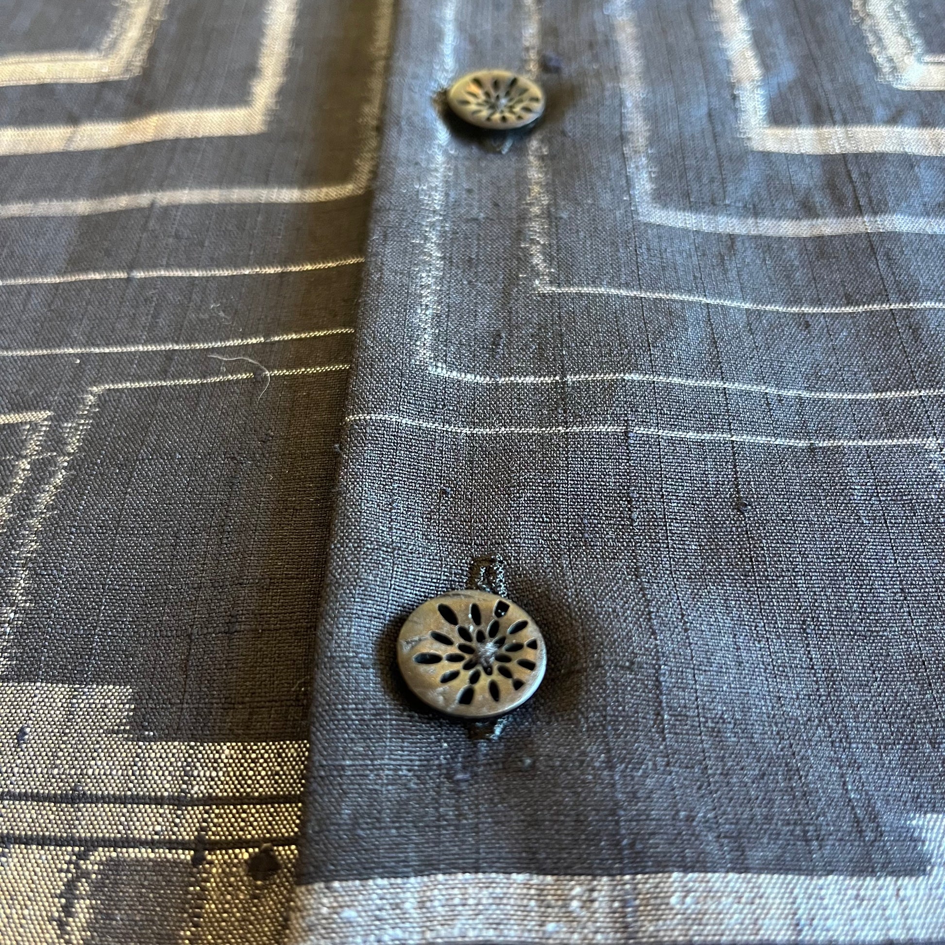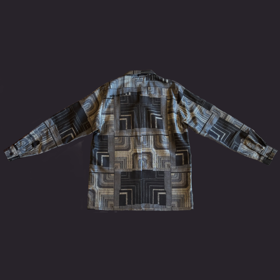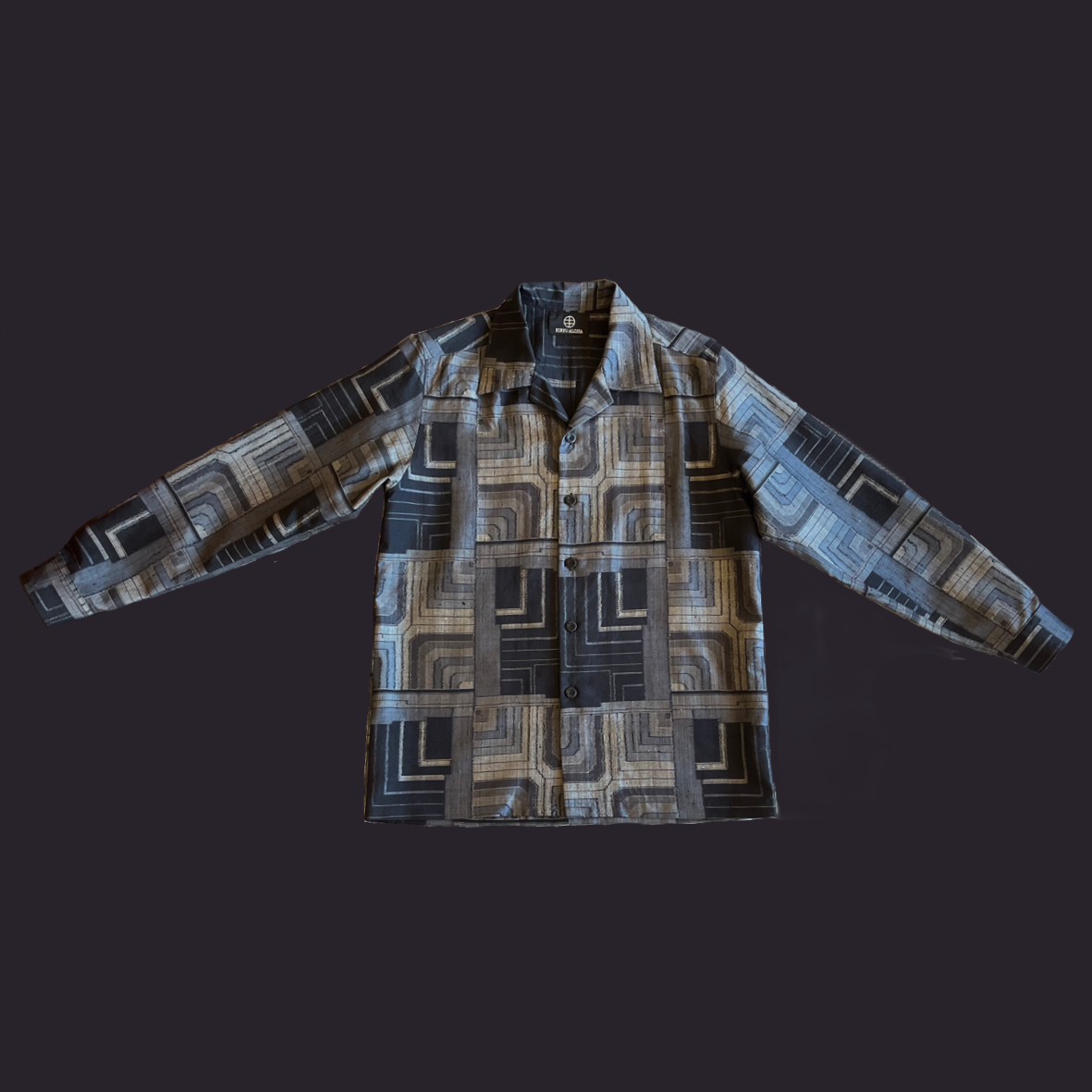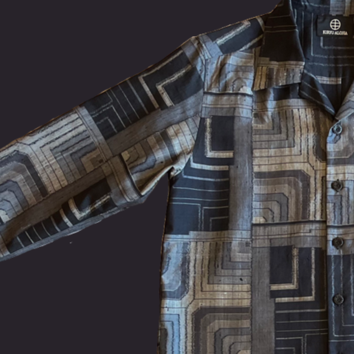 四角形や八角形を重ねた柄を織りで表現した紬から長袖のアロハシャツに。