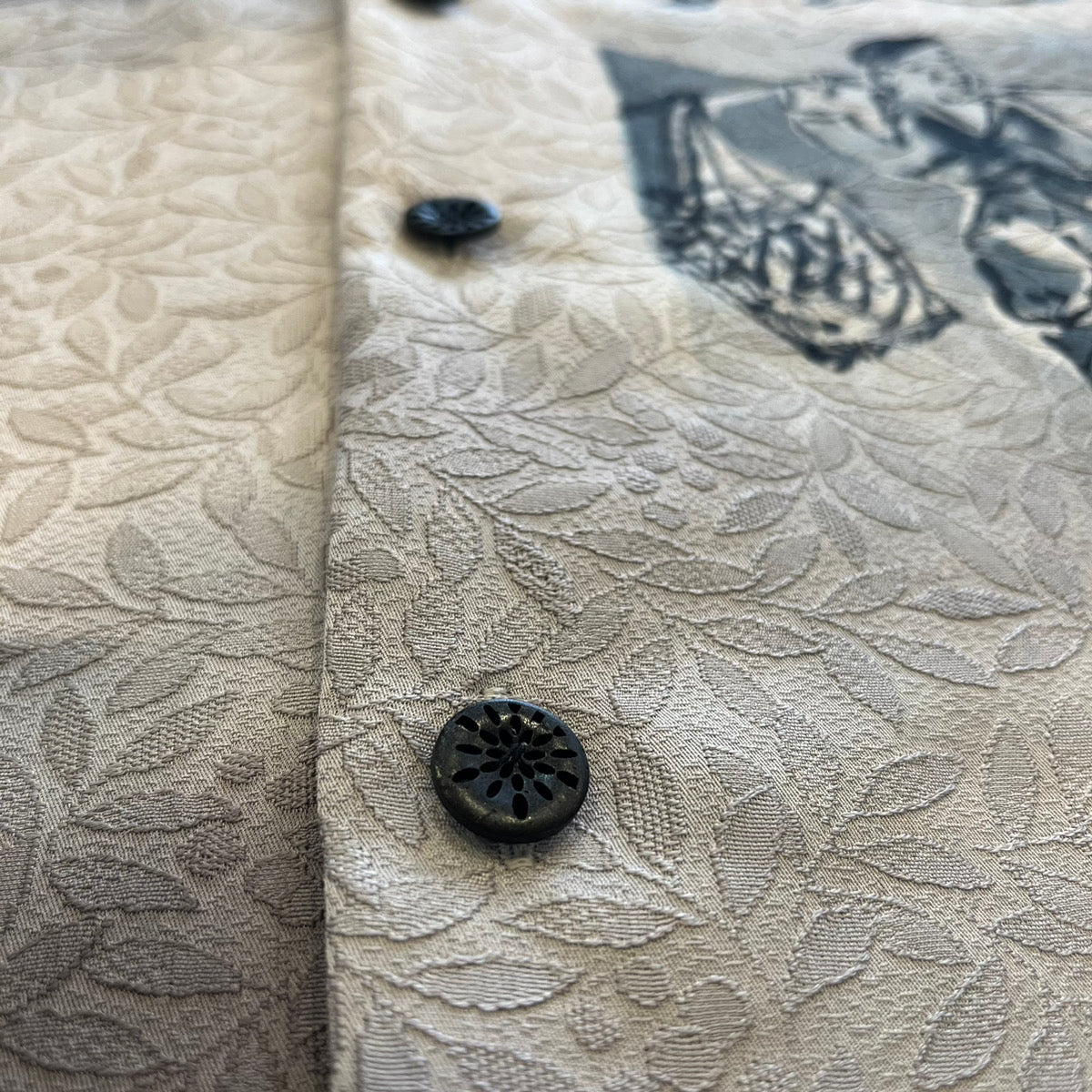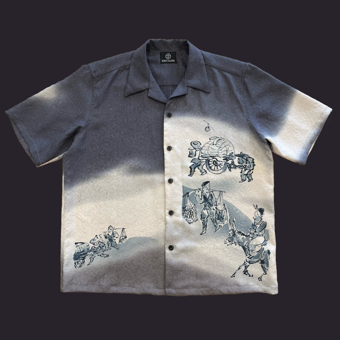 水墨画のように手描き染めで描いた訪問着をアロハシャツに。