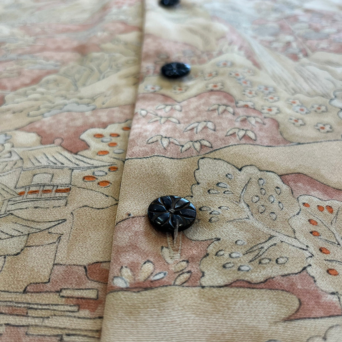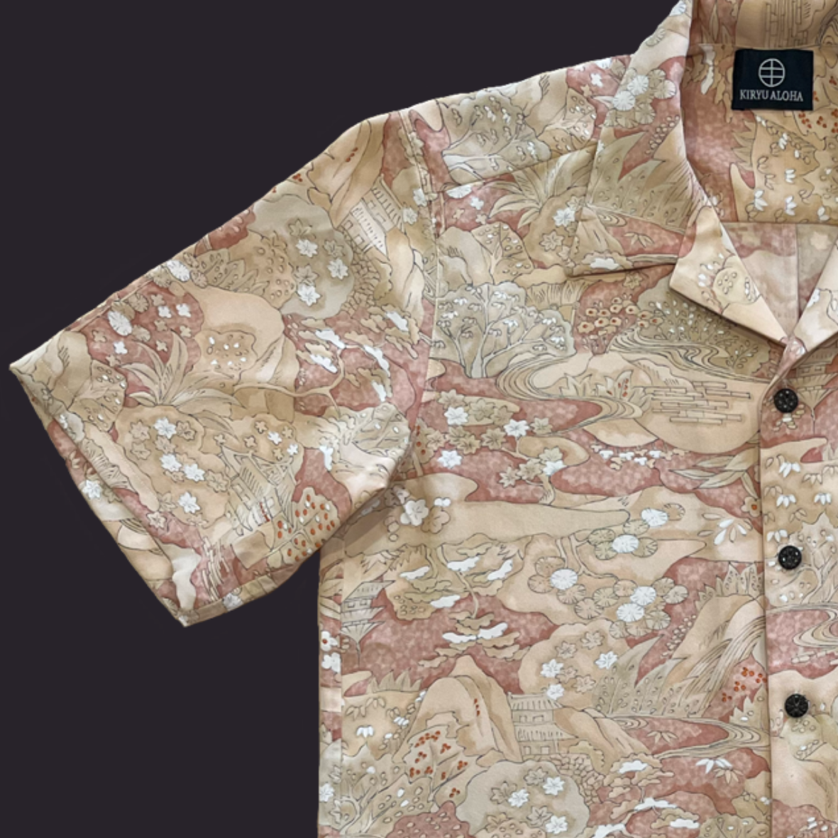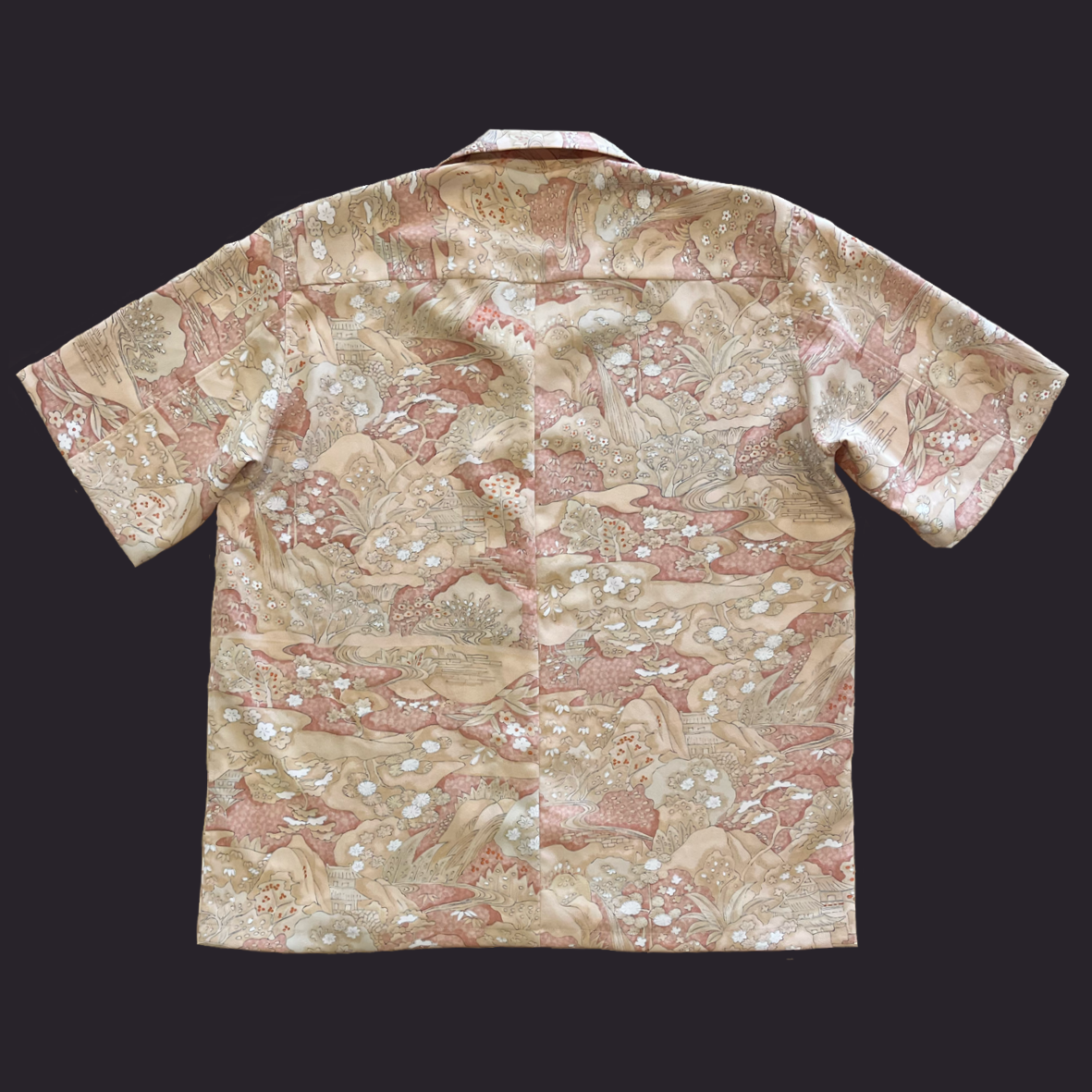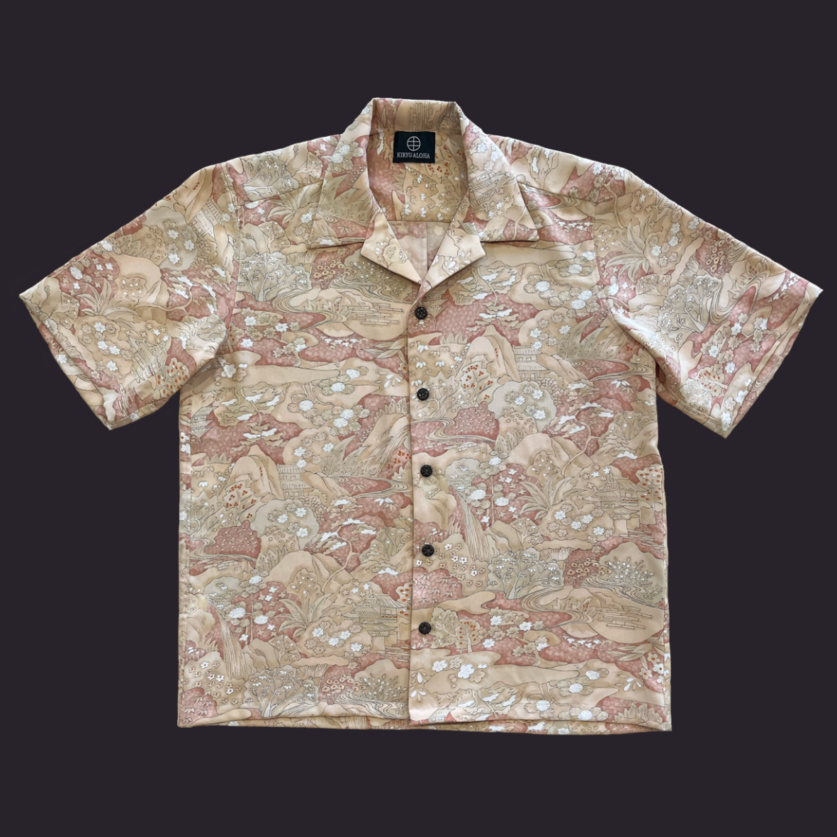 型染で様々な吉祥文様を寄せた小紋をアロハシャツに。