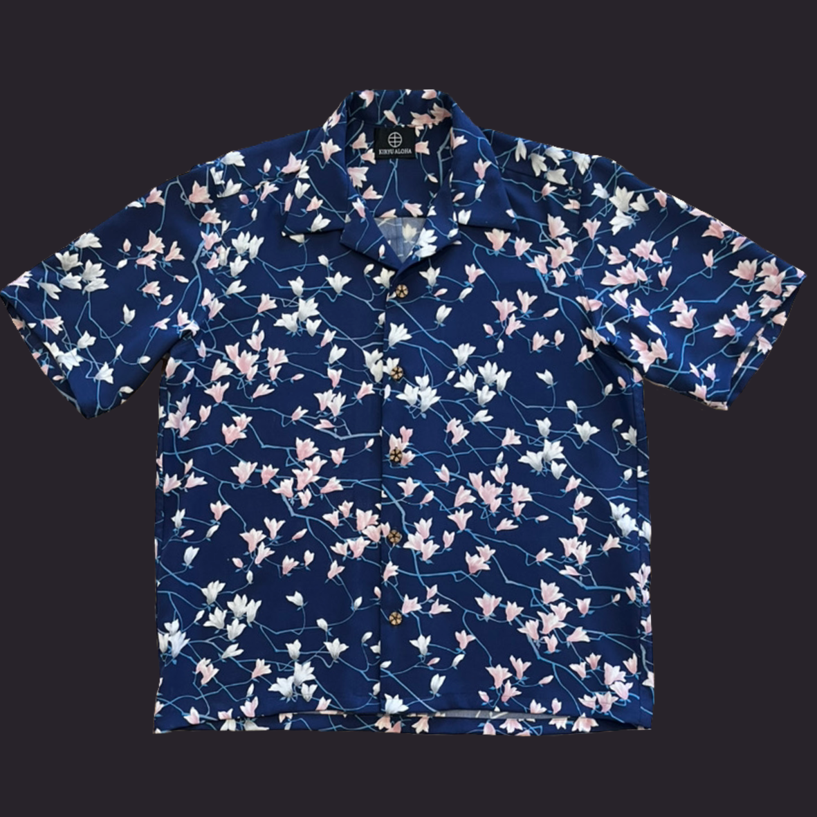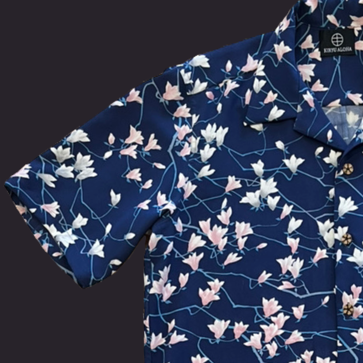 型染で木蓮の花と枝をえがいた着物からアロハシャツに。