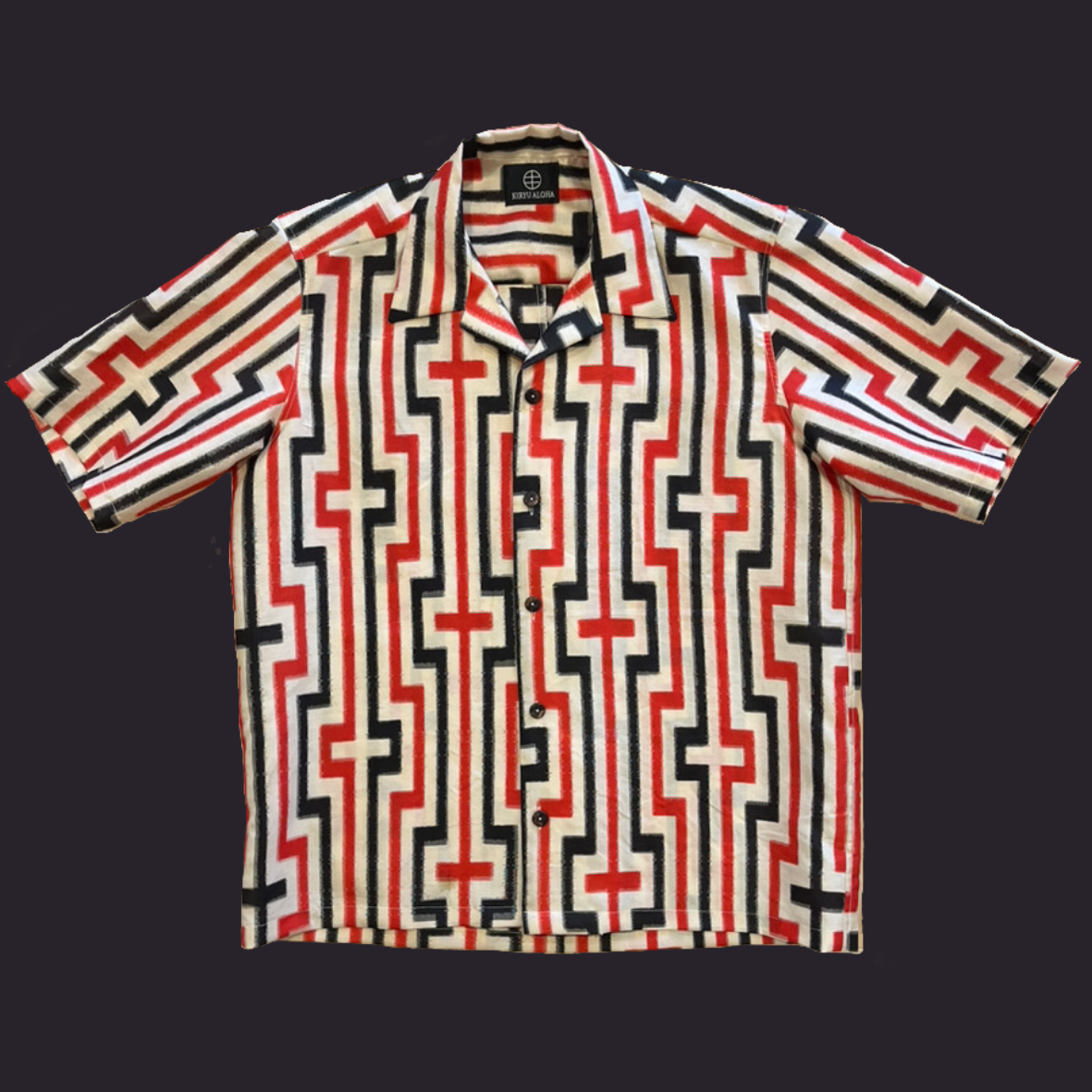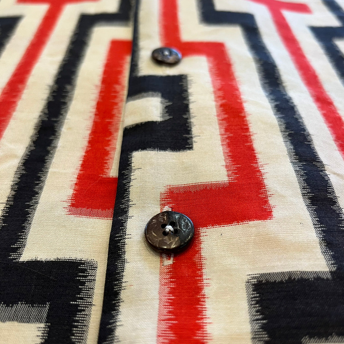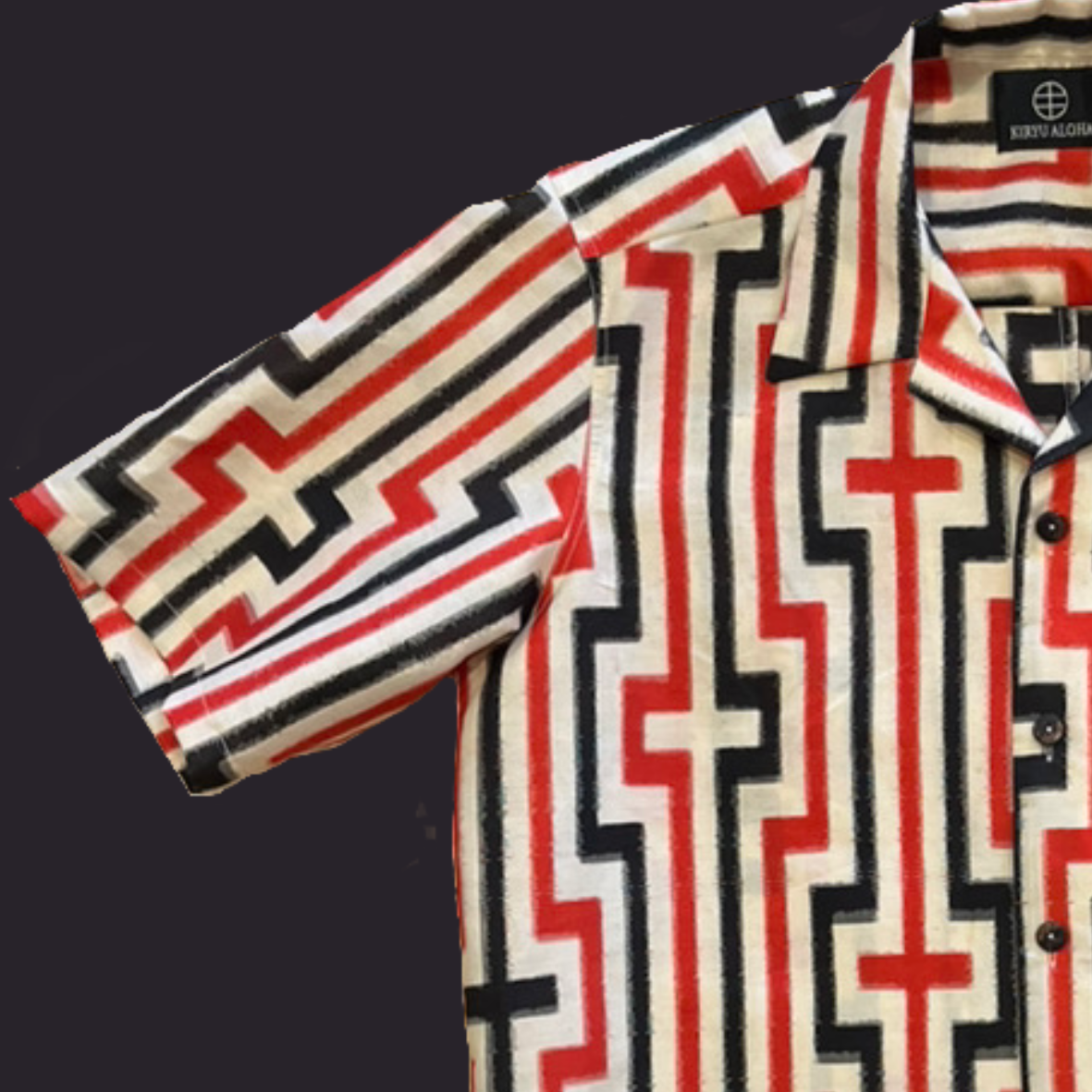 銘仙で不思議な幾何学文様を織り出した着物をアロハシャツに。