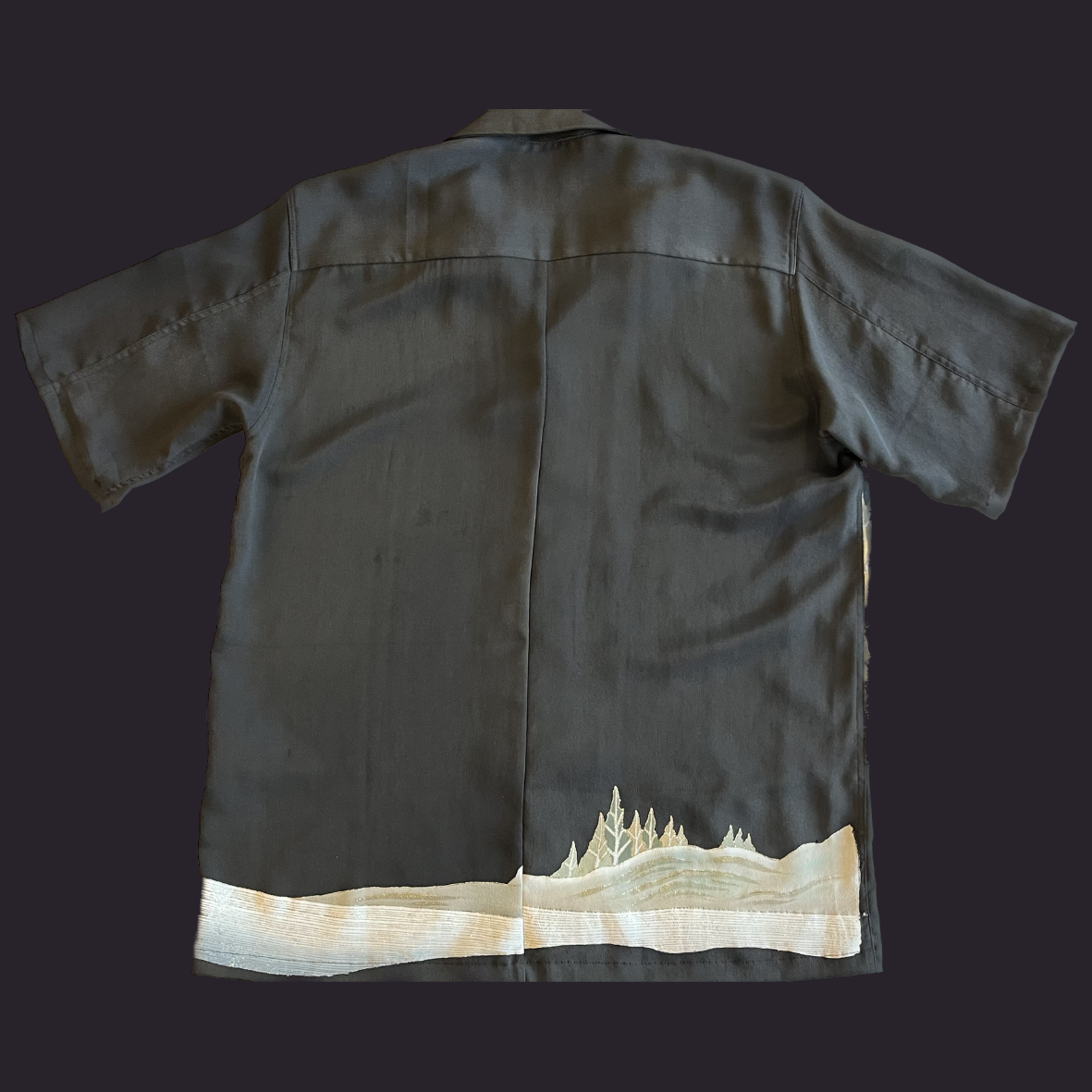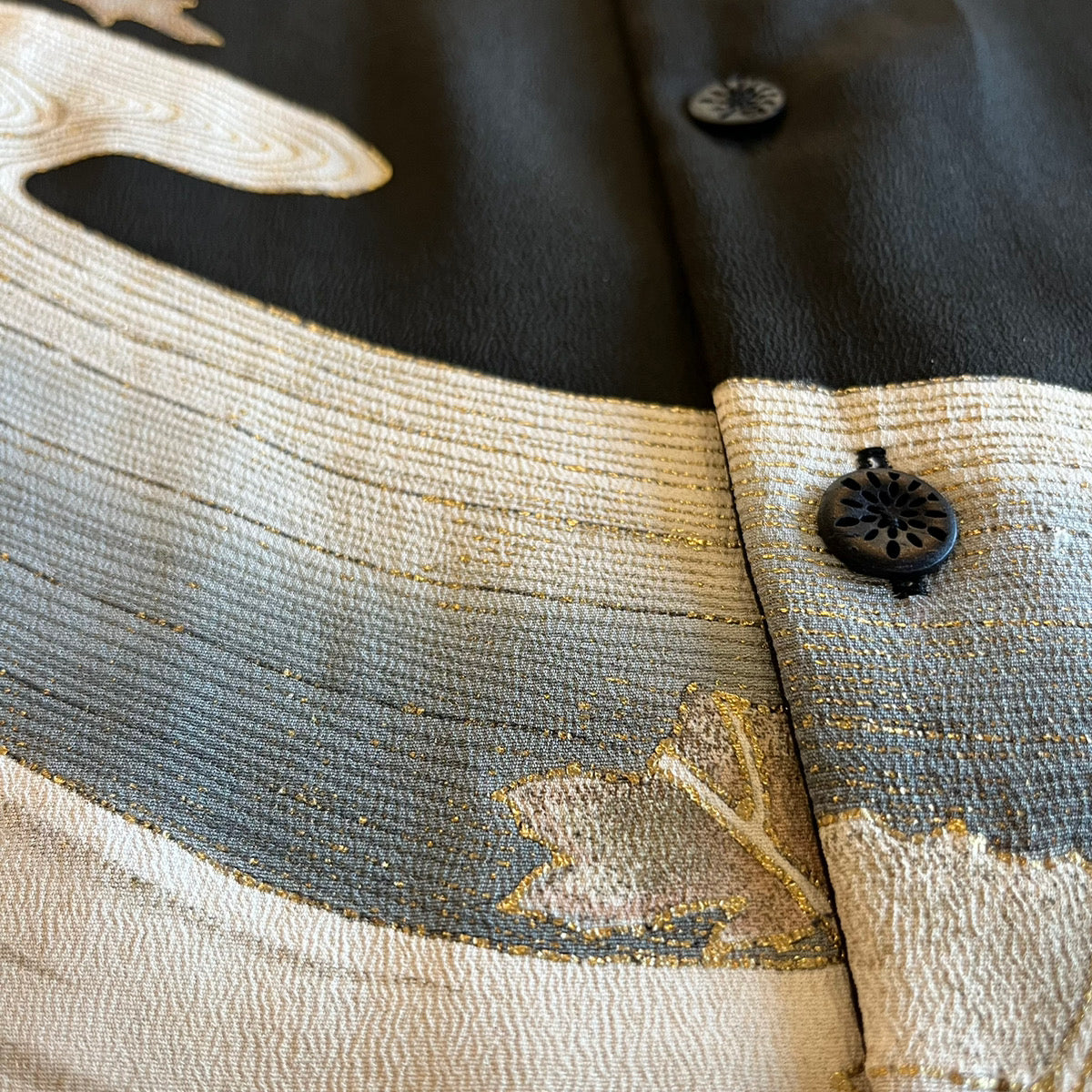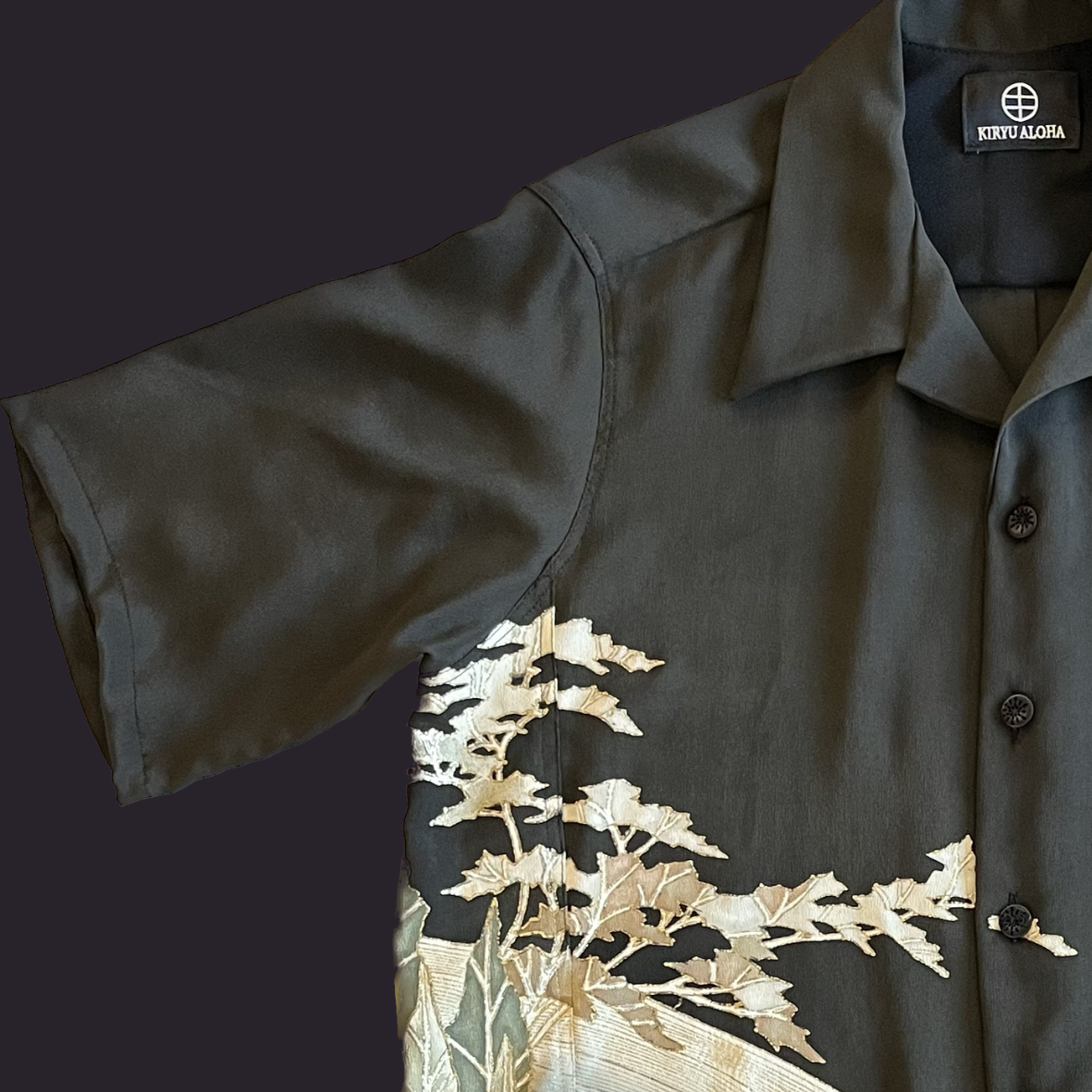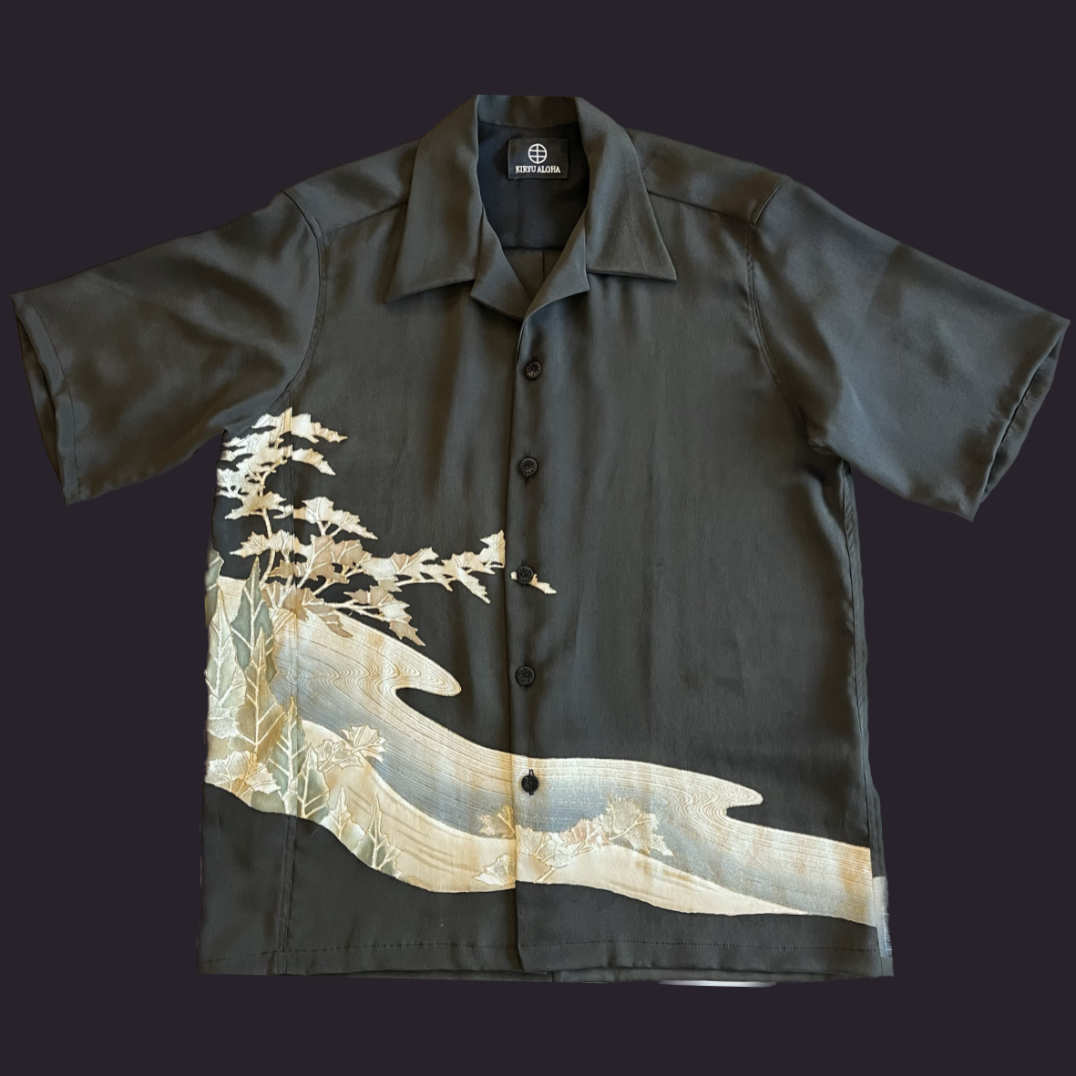 友禅で流れる川と木々を描いた黒留袖をアロハシャツに。