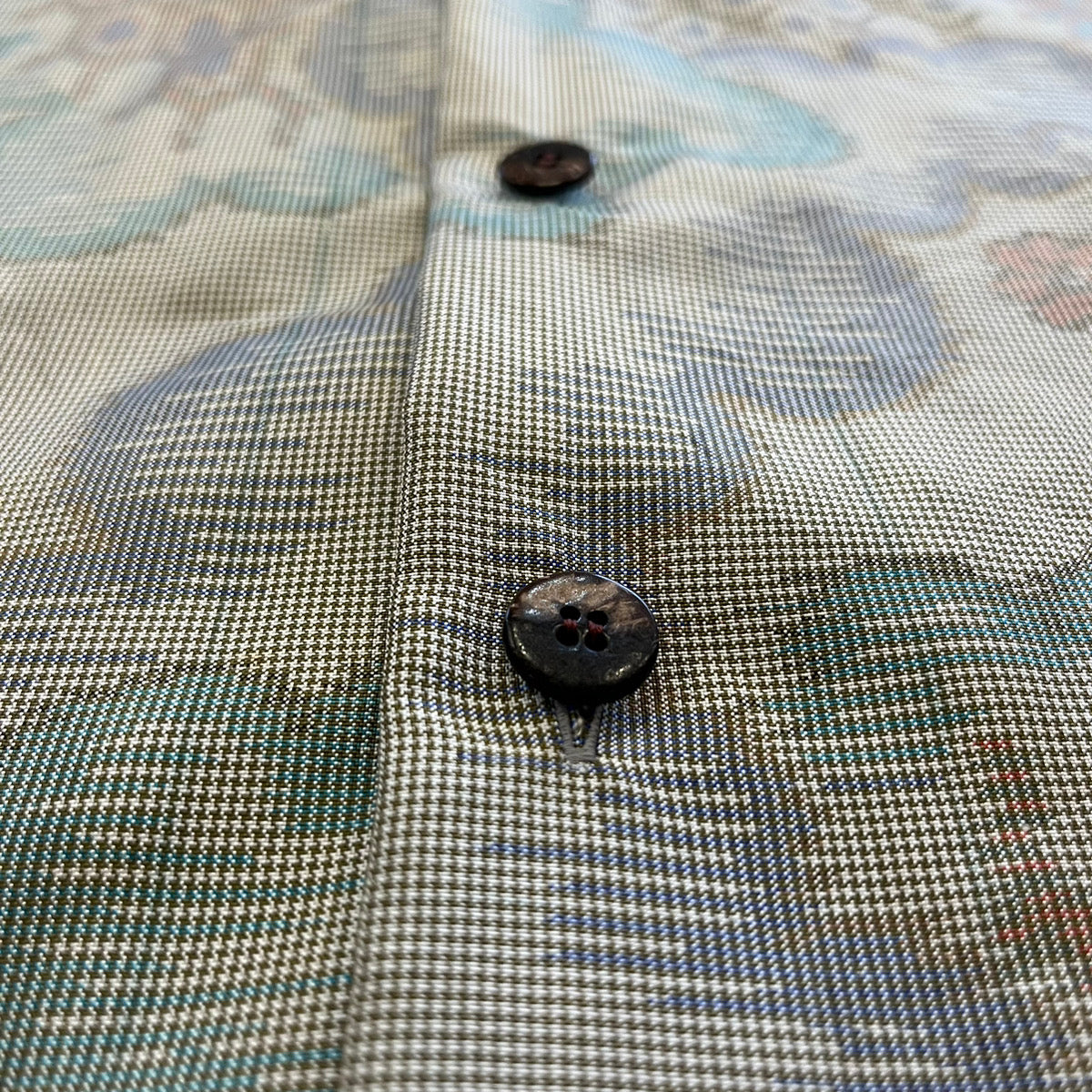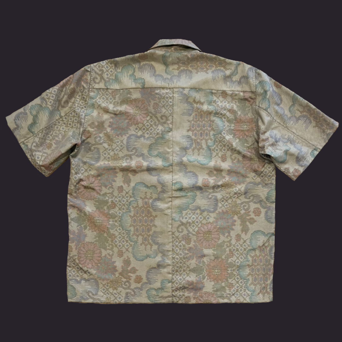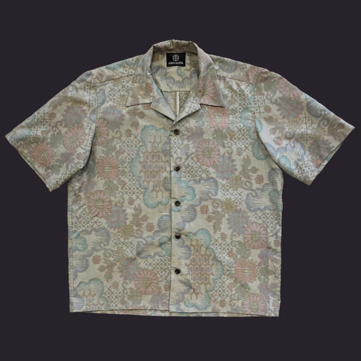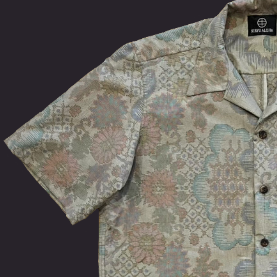 花々と二色の瑞雲を織り出した大島紬をアロハシャツに。